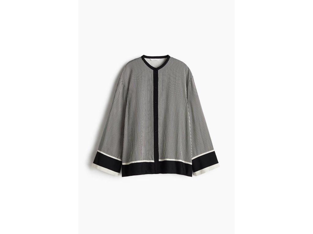Košile má nízký stojáček (páskový límeček) a přední zapínání na knoflíky, které jí dodává čistý a minimalistický vzhled. Spuštěná ramena a dlouhé široké rukávy přispívají k ležérnímu stylu.