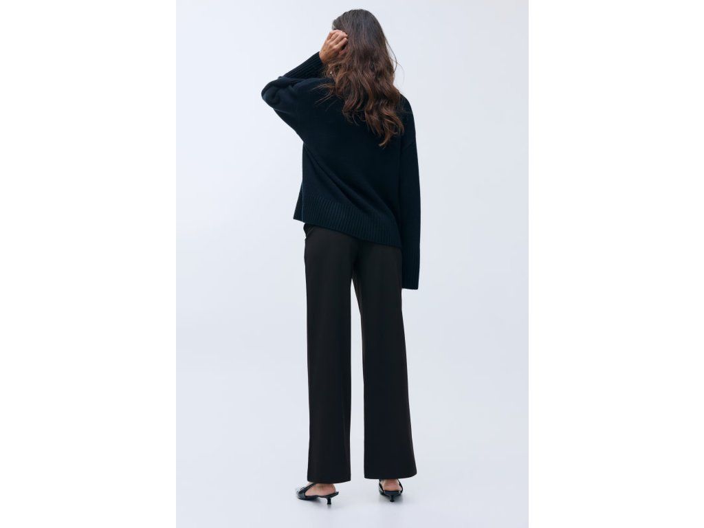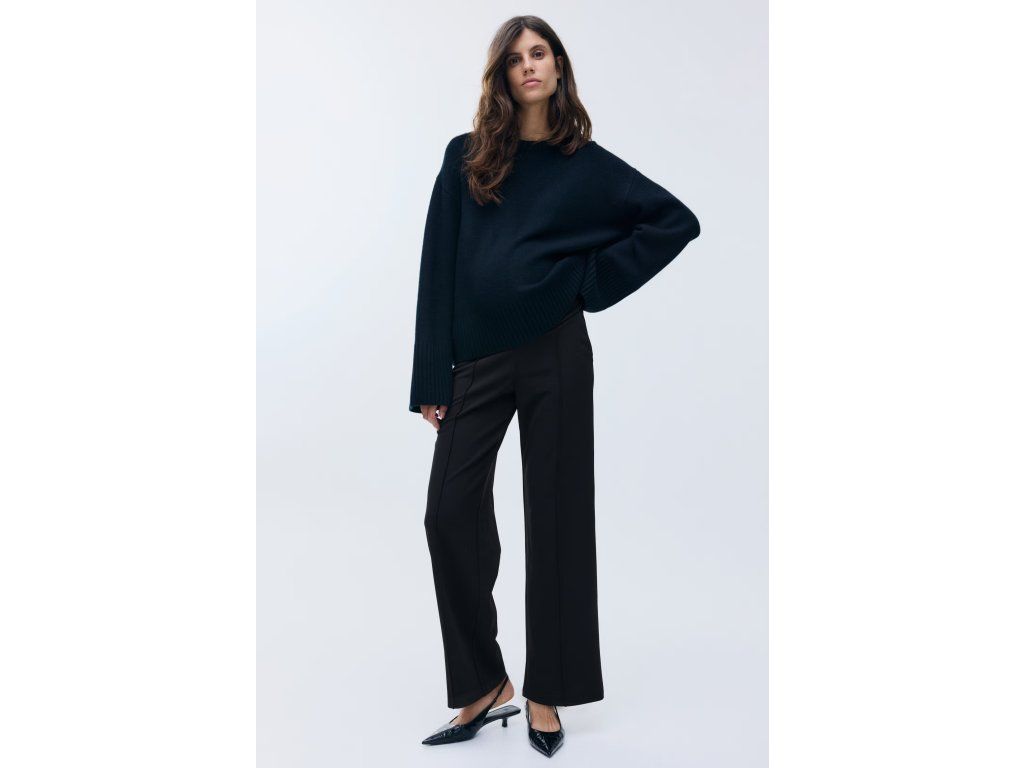 Černé kalhoty z krepového žerzeje s pružným pasem, který se přizpůsobí rostoucímu bříšku. Elegantní rovné nohavice s puky dodávají sofistikovaný vzhled.