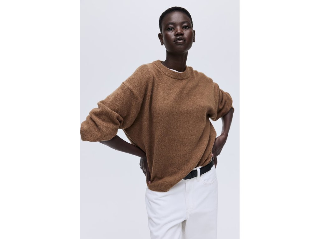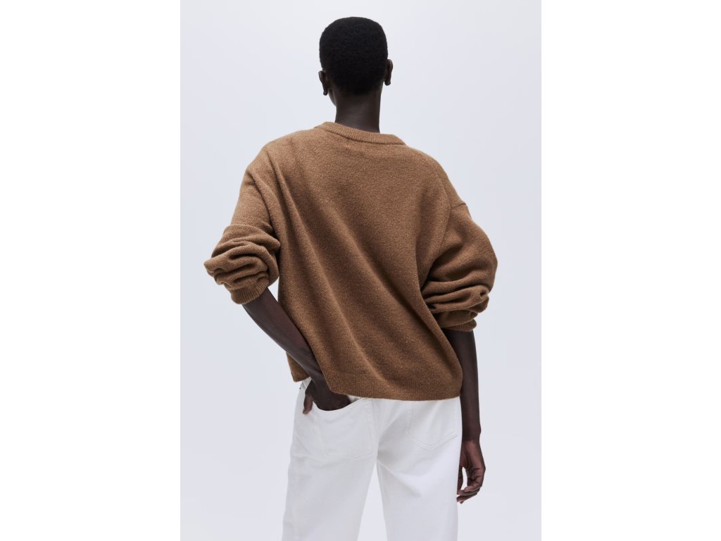 Svetr má kulatý výstřih se žebrovaným lemem, spuštěná ramena a dlouhé rukávy. Díky loose fit střihu působí moderně a uvolněně a zároveň poskytuje dostatek pohodlí při nošení.