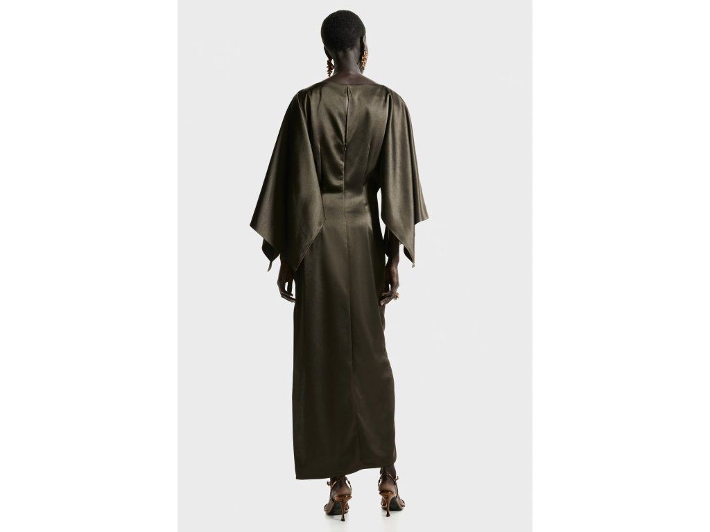Dlouhé šaty z měkce splývavého saténu v tmavě zeleném odstínu působí elegantně a nepřehlédnutelně. Pelerínkové rukávy, lodičkový výstřih a boční rozparek vytvářejí efektní slavnostní vzhled.