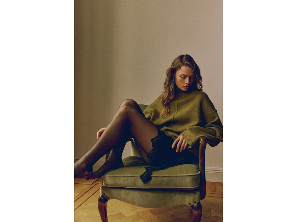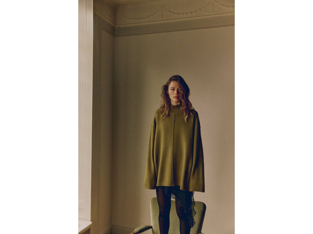 Model má vysoký žebrovaný límec, který zahřeje v chladném počasí. Zajímavým detailem je malý zadní průstřih ve tvaru písmene V, který dodává svetru originální vzhled.