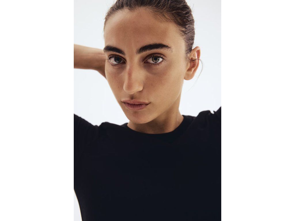 Tričko H&M je zpracované z měkkého žebrovaného žerzeje s podílem bavlny, viskózy a elastanu, díky čemuž nabízí pohodlí, pružnost a příjemný pocit při nošení. Přiléhavý slim fit střih zvýrazní siluetu a zároveň zůstává komfortní pro běžné nošení.