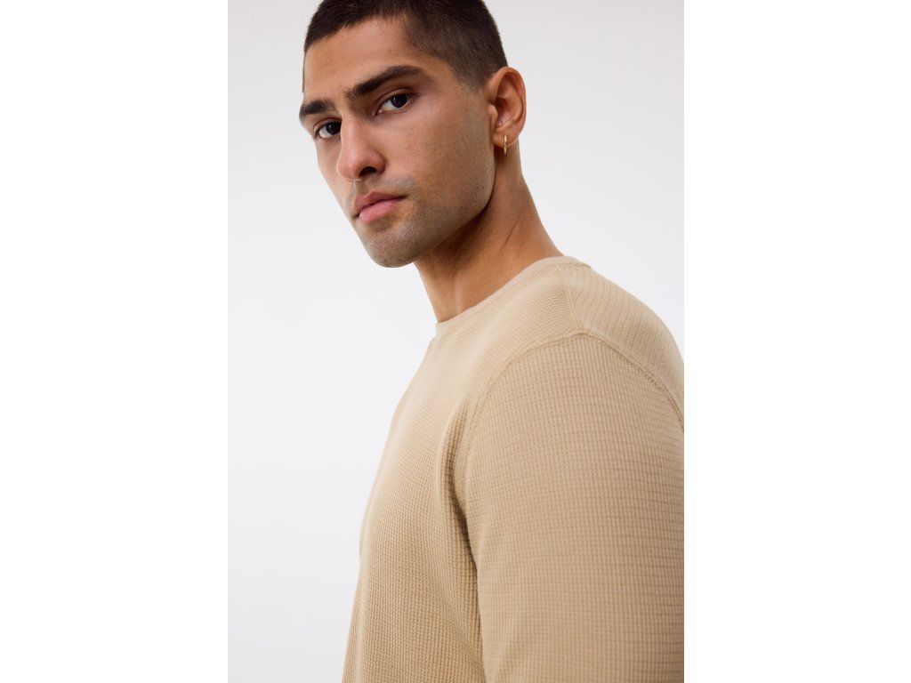 Slim fit střih přiléhá k tělu a vytváří čistou, moderní siluetu. Triko doplňuje kulatý výstřih, dlouhé rukávy a žebrované lemy u výstřihu i rukávů, které podtrhují jeho nadčasový vzhled.