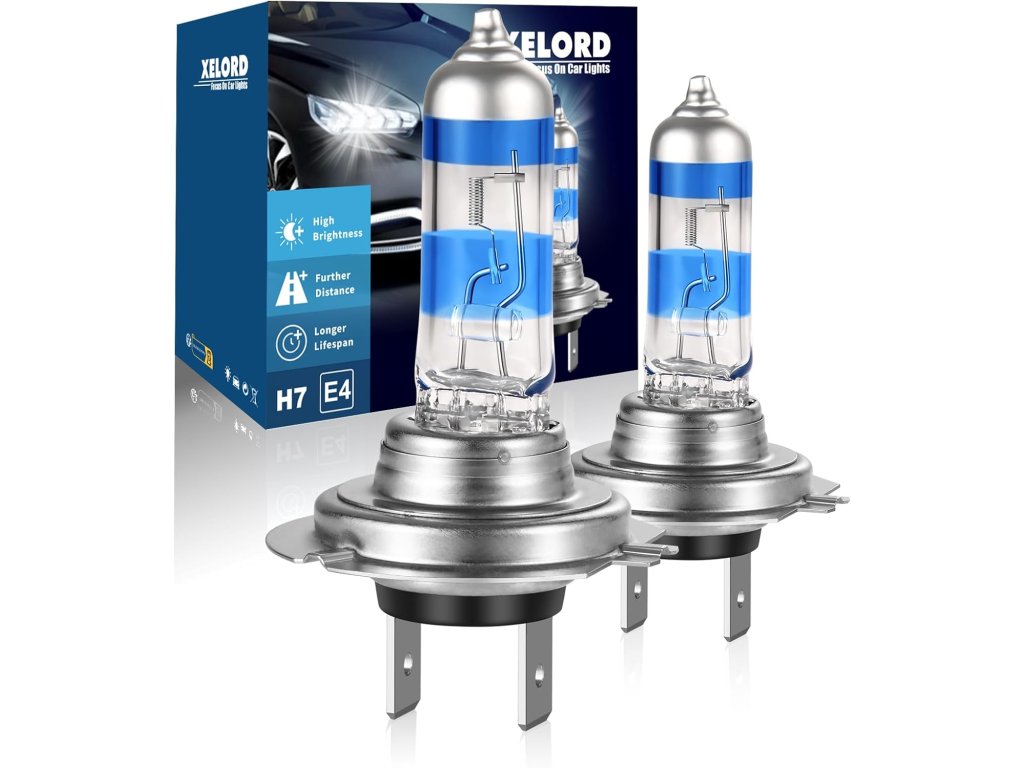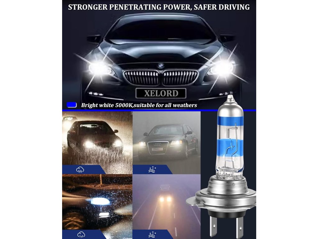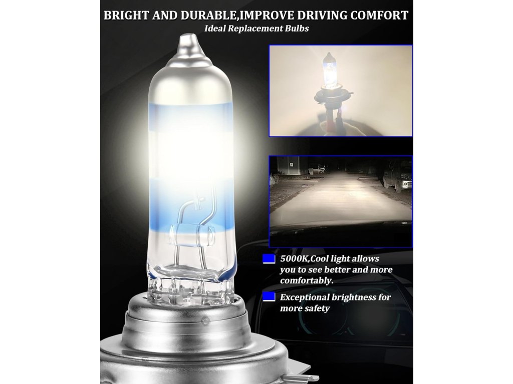 Tyto vysoce výkonné halogenové žárovky H7 s napětím 12 V a výkonem 55 W poskytují teplé bílé světlo o teplotě 5000 K, které je blízké přirozenému slunečnímu světlu, a tím snižují únavu při noční jízdě. Nová technologie křemenného skla zajišťuje ultra přesný světelný výkon a lepší odrazy od vozovky. Žárovky se vyznačují stabilním jasem, úsporou energie a dlouhou životností. Jejich instalace je velmi snadná a rychlá, zvládnete ji bez nářadí do 5 minut díky 100% kompatibilitě s originálními H7 paticemi (Plug & Play). Tyto halogenové žárovky mají evropské schválení (zkušební značka E) a jejich použití je bez nutnosti registrace. V balení naleznete 2 kusy halogenových žárovek H7, vyrobených z vysoce kvalitních materiálů pro spolehlivost a dlouhou životnost. Jsou vhodné pro 12V DC světlomety automobilů a motocyklů, a to jak pro dálková, tak pro potkávací světla. Před instalací si prosím zkontrolujte příručku k vašemu vozidlu.