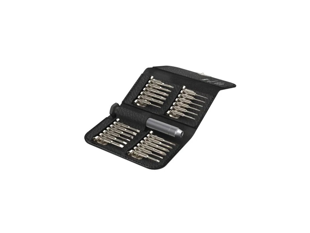 Součástí sady je lehký hliníkový držák s drážkovaným protiskluzovým povrchem, který zajišťuje pevný úchop a přesnou manipulaci. Vše je přehledně uloženo v elegantním zavíracím pouzdře z umělé kůže, které je díky svým kompaktním rozměrům snadno přenosné a vejde se i do kapsy. Rotační zakončení rukojeti umožňuje snadné šroubování pouhým otáčením prstů, což výrazně usnadňuje práci v těžko přístupných místech.