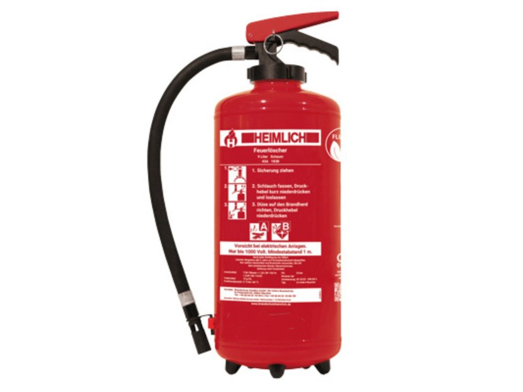 Pěnový hasicí přístroj Heimlich S 9 HeK-4 s náplní 9 litrů, bez obsahu fluoru. Účinně hasí požáry třídy A (pevné látky) a B (kapalné látky). Vysoká hasicí schopnost: 43 A a 183 B. Vhodný i pro hašení elektrických zařízení pod napětím do 1000 V. Dodává se včetně nástěnného držáku a držáku hadice. Splňuje normu DIN EN 3-7. Hmotnost 14,9 kg, rozměry 55 x 32 cm. Technologie dobíjecího hasicího přístroje, rok výroby 2024.
