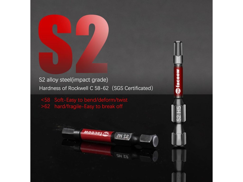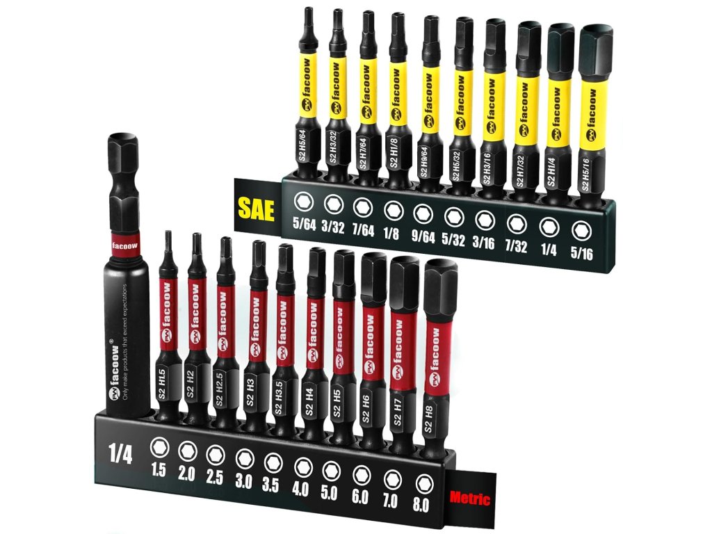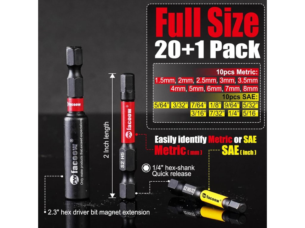 Tato obsáhlá sada 21 hex bitů obsahuje metrické (10 ks: 1.5-8mm) a SAE (10 ks: 5/64"-5/16") velikosti pro širokou škálu aplikací. Bity jsou vyrobeny z vysoce kvalitní oceli S2, která splňuje mezinárodní standardy a je kalena na tvrdost HRC 58-62 pro maximální odolnost. Precizní CNC obrábění zajišťuje negativní toleranci (o 0.2mm menší než standard), což zaručuje přesné usazení a optimální výkon. Silné magnetické hroty usnadňují manipulaci se šrouby a jejich přesné umístění. Fosfátovaný černý povrch chrání bity proti korozi i ve vlhkém prostředí. Sada je ideální pro opravy spotřební elektroniky, montáž nábytku, RC modely, 3D tiskárny, postele, motocykly, automobily, puškohledy, jízdní kola a další. Součástí balení je i 2.3" šestihranné prodloužení pro práci v úzkých a hlubokých prostorech.