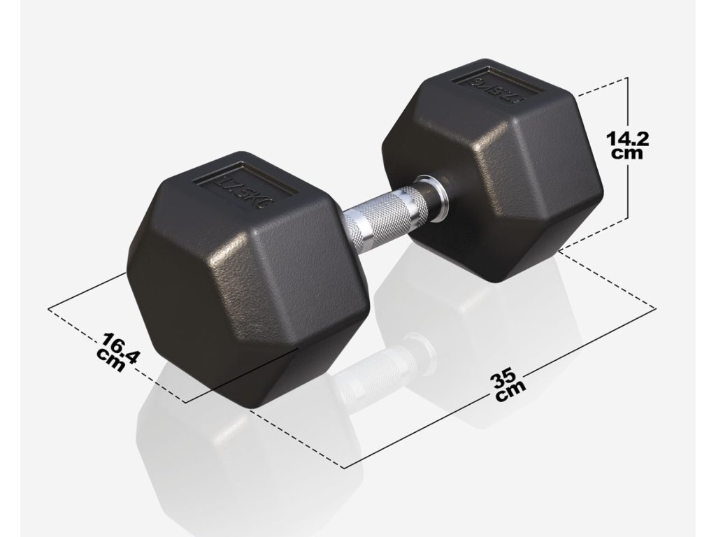 Šestihranný tvar závaží zabraňuje kutálení činky po podlaze, což zvyšuje bezpečnost a pohodlí při cvičení. Pogumovaný povrch je šetrný k podlaze, protiskluzový a zajišťuje dlouhou životnost činky. Jádro závaží je vyrobeno z odolného litého železa.