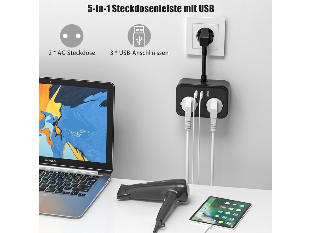 Prodlužovací stanice HITRENDS přináší maximální efektivitu do vašeho pracovního prostoru. Hlavní předností tohoto modelu je schopnost obsloužit až pět různých spotřebičů či digitálních zařízení z jednoho zdroje napájení. Kombinace klasických síťových zásuvek a integrovaných USB portů eliminuje potřebu používat množství samostatných adaptérů, což pomáhá udržovat pořádek a šetří místo.