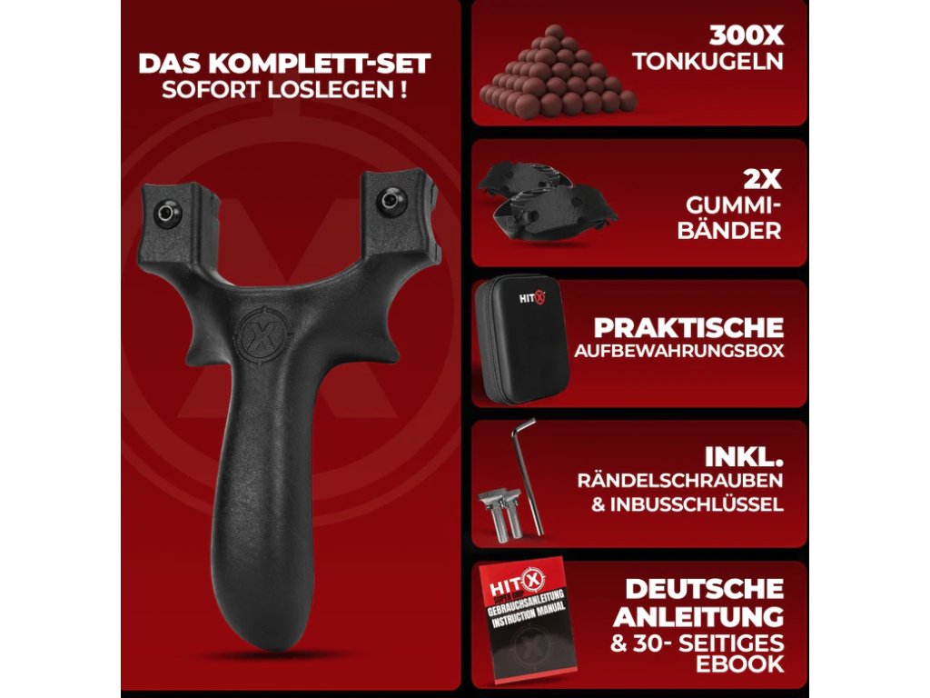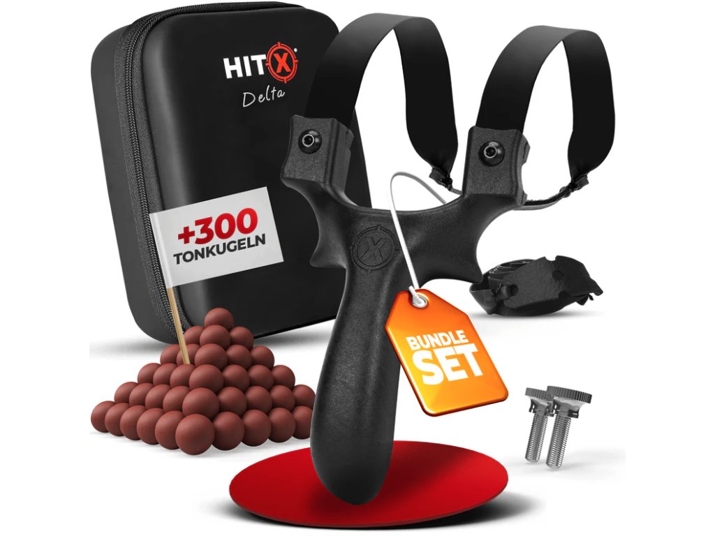 Sada obsahuje vše potřebné pro střelbu a manipulaci. Prak je vybaven unikátními klipy hitx duo, které zajišťují stabilitu a snadné upevnění. Konstrukce s nízkou hmotností 182 g umožňuje pohodlné držení a snadné přenášení. Součástí balení je také 300 kusů hliněných kuliček, které slouží jako připravená munice.