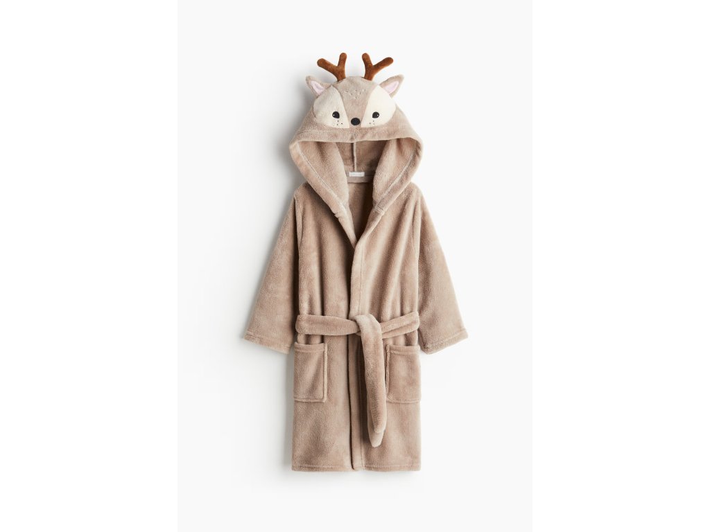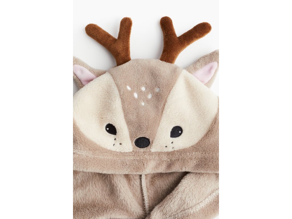 Hravý dětský župan z příjemně měkkého flísu zahřeje po koupeli i během chladnějších rán. Béžové provedení s aplikacemi a kapucí s vyšívanými detaily ve stylu soba dodává roztomilý a veselý vzhled.