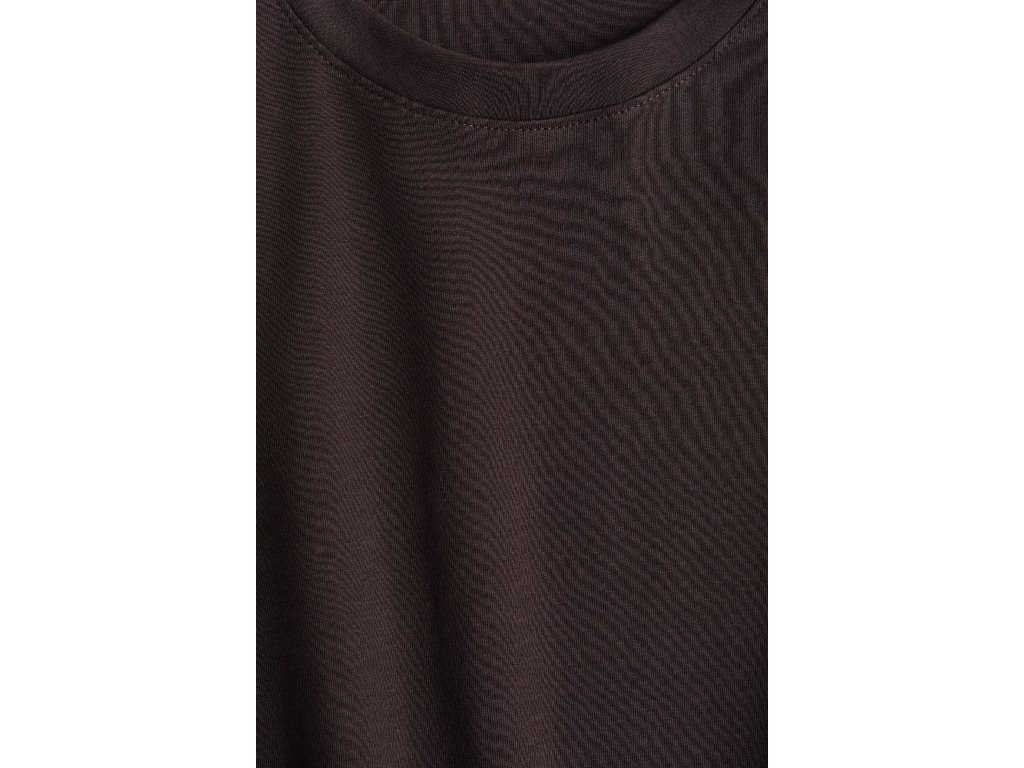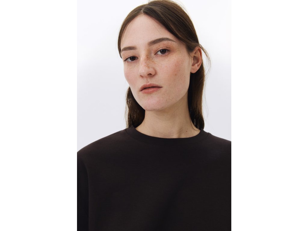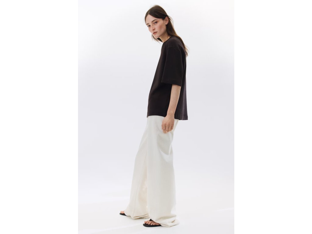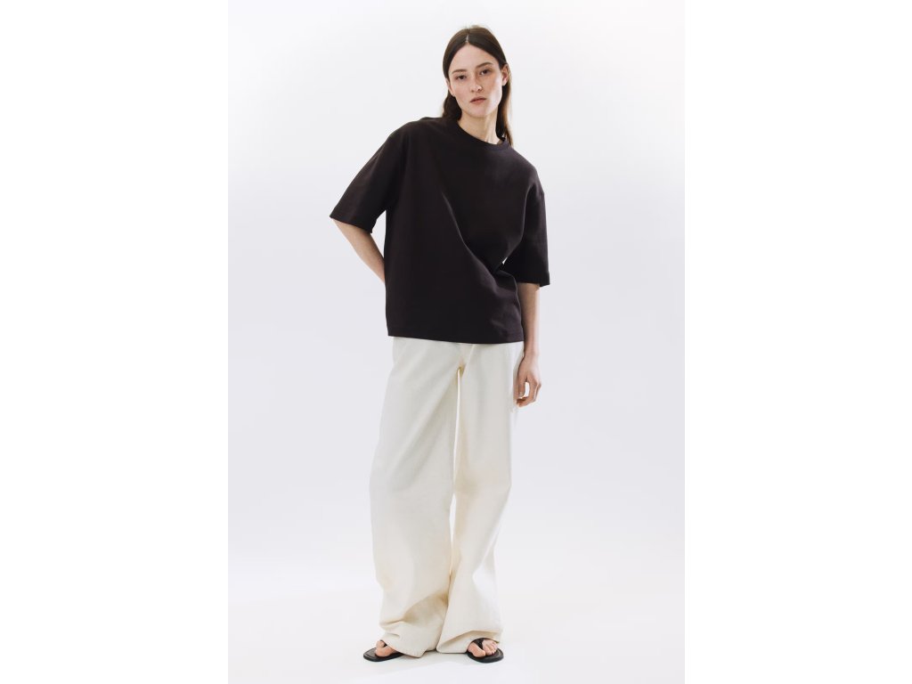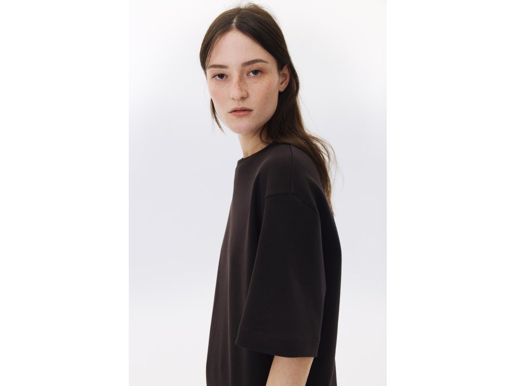 Volný hranatý (boxy) střih poskytuje pohodlí a ležérní siluetu. Spuštěná ramena a rukávy končící těsně nad loktem podtrhují moderní oversized vzhled.