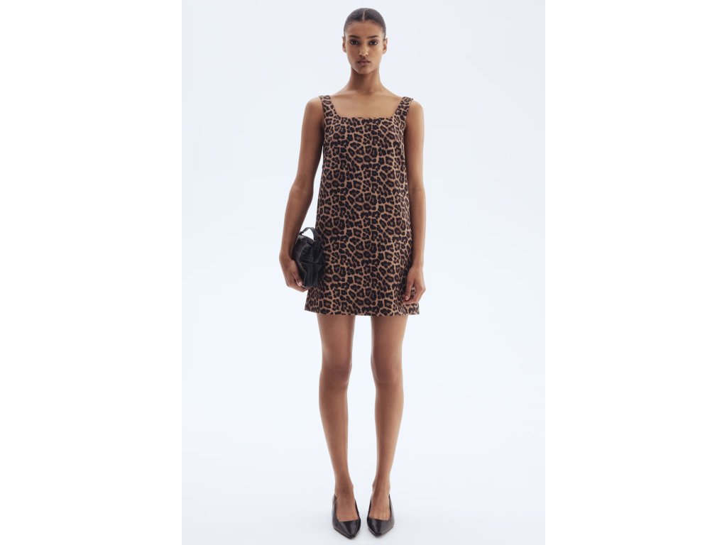 Krátké šaty rovného střihu (shift dress) v béžovém provedení s leopardím vzorem zaujmou na první pohled. Přiléhavý střih Slim fit zvýrazňuje siluetu, zatímco pružná tkanina s příměsí elastanu zajišťuje pohodlí při nošení.