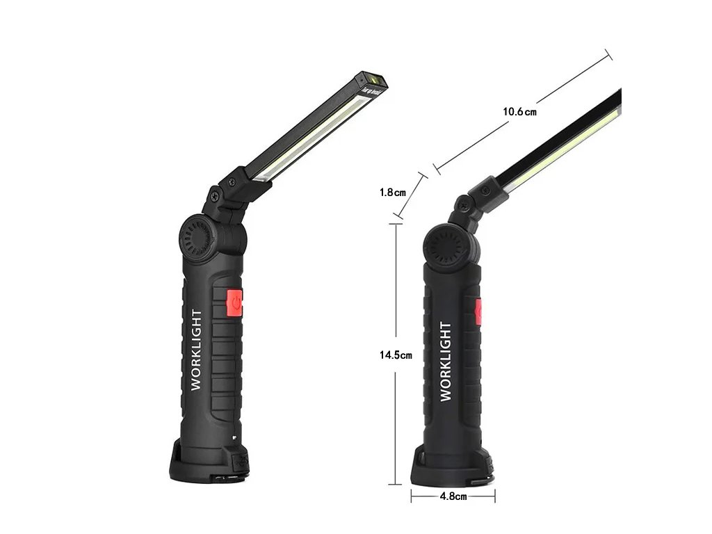 Svítilna disponuje dvěma úrovněmi jasu a je napájena integrovanou Li-pol baterií o kapacitě 1800 mAh, která zaručuje provoz po dobu 4 až 6 hodin. Konstrukce z odolného ABS plastu obsahuje otočnou základnu, silný magnet pro uchycení na kovové povrchy a výsuvný hák, což umožňuje nasměrovat světlo přesně tam, kam je potřeba. Díky absenci kabelu je manipulace s lampou bezpečná a snižuje se riziko pádu. Své využití najde v autoservisech, při údržbě strojů, v kempu nebo jako pohotovostní svítilna v domácnosti.