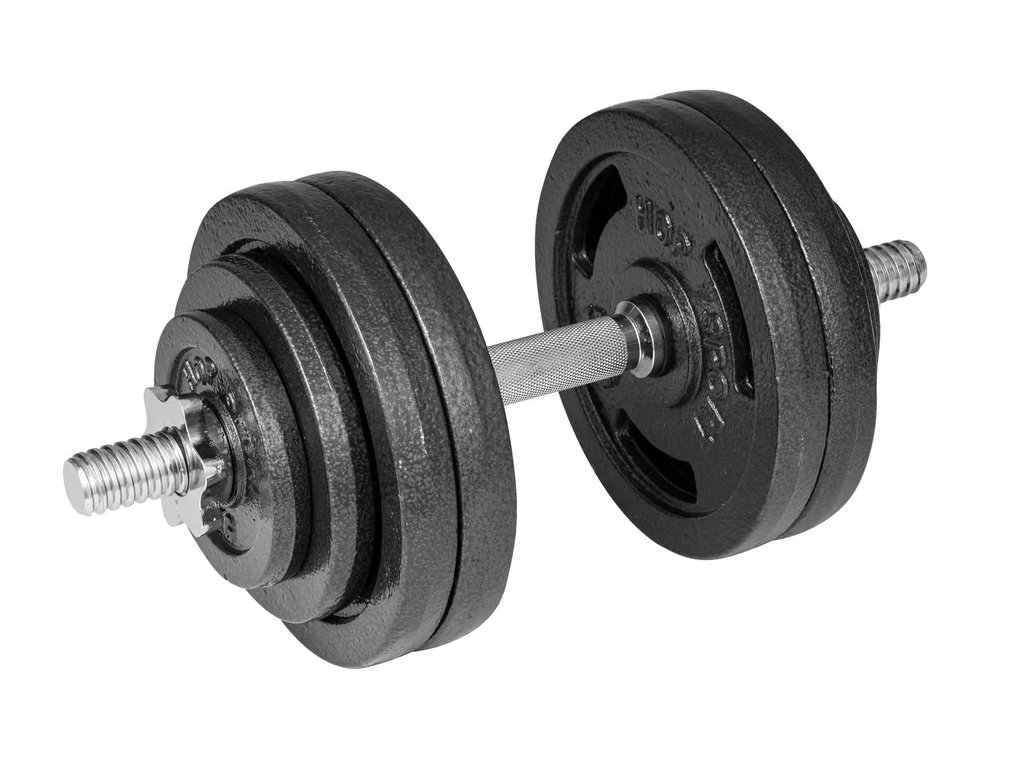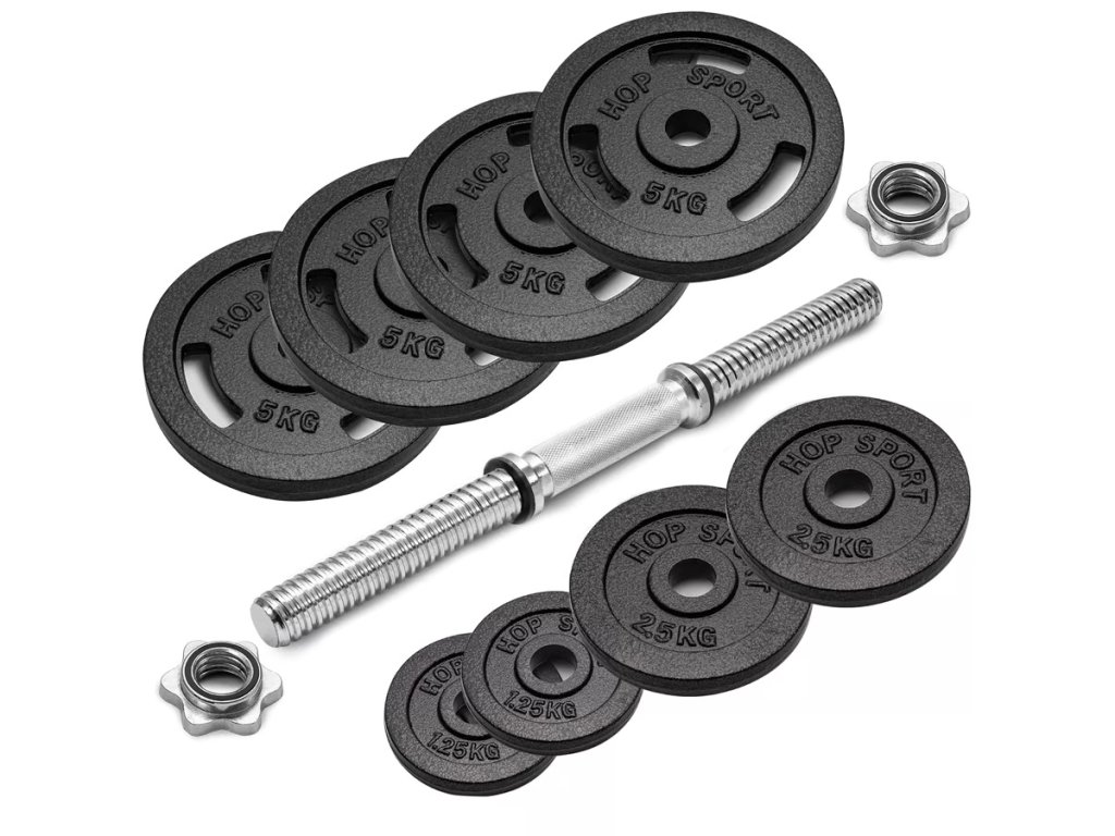 Nakládací činkový set Hop-Sport 2x15 kg PRO. 2x hřídel 45 cm, cementové kotouče (2x 5 kg, 4x 2,5 kg, 6x 1,25 kg). Pro efektivní posilování horní části těla.
