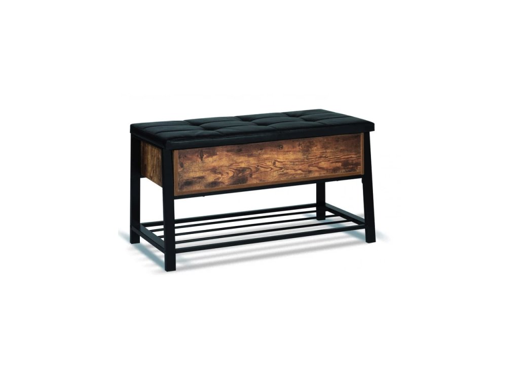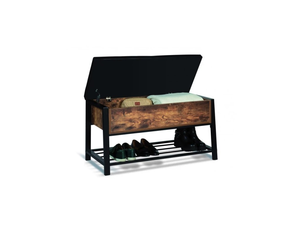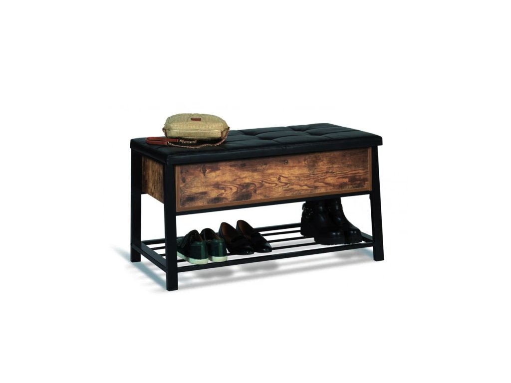 Tato lavice na boty od značky Idomya je praktickým a stylovým řešením do předsíně. Kombinuje úložný prostor na boty a pohodlné sedadlo. Lavice má vintage vzhled a je vyrobena z vysoce kvalitních dřevotřískových desek (tloušťka 12 mm) odolného kovového rámu a je doplněna polstrovaným sedákem z koženky. Nabízí jednu kovovou polici na boty a velký úložný prostor pod sedákem pro další doplňky.
