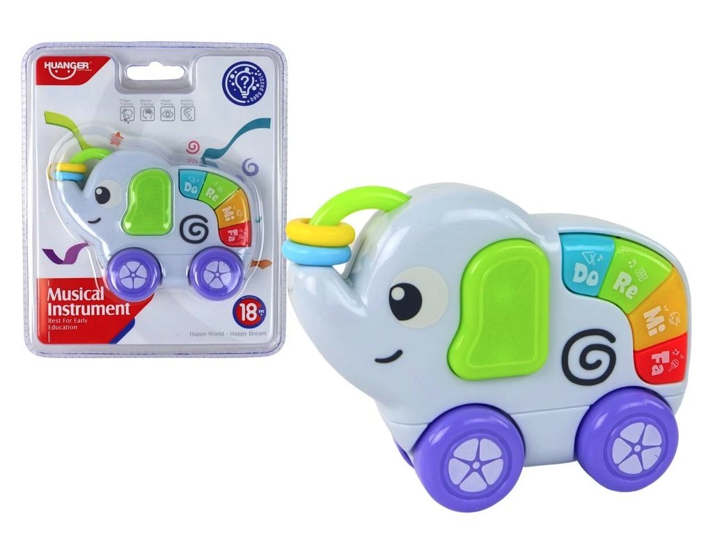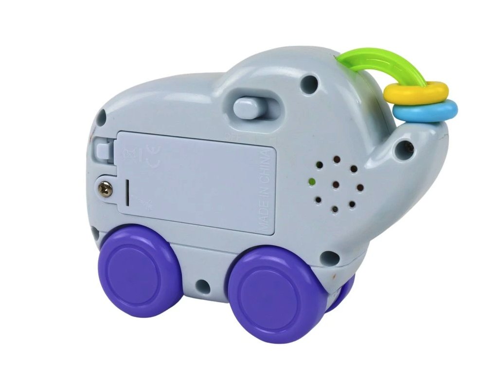 Interaktivní slon na kolečkách představuje zábavného společníka, který podporuje kognitivní schopnosti a představivost dítěte. Hračka je osazena čtyřmi hlavními kolečky pro plynulý pohyb po podlaze a dvěma menšími kolečky na chobotu, se kterými lze otáčet. Tyto pohyblivé prvky motivují děti k aktivitě a rozvíjejí jejich jemnou motoriku.