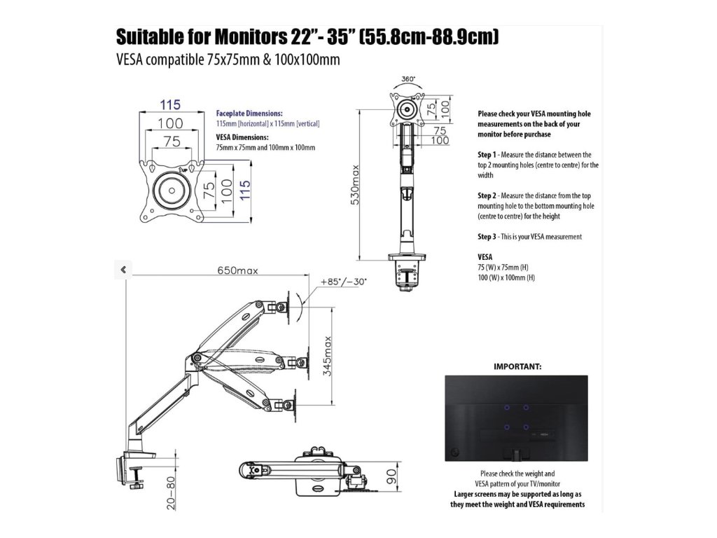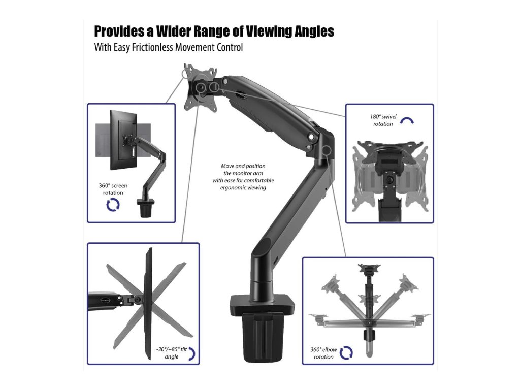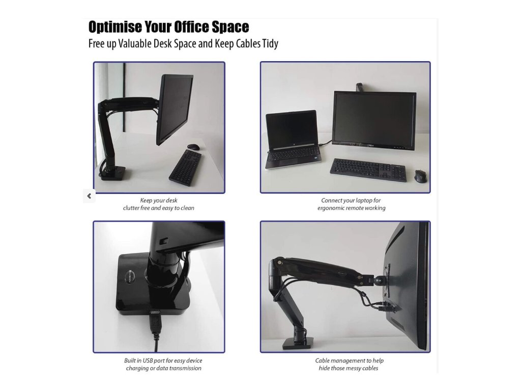 Kromě zlepšení ergonomie rameno efektivně uvolňuje drahocenný prostor na pracovním stole. Široký rozsah náklonu od +85° do -30° zajišťuje stabilitu v jakékoli pozici, ať už pracujete vsedě nebo vestoje. Praktickým doplňkem je USB port integrovaný přímo v základně držáku, který slouží pro snadné nabíjení elektronických zařízení nebo připojení periferií s minimem viditelných kabelů. Instalace je univerzální a lze ji provést dvěma způsoby uchycení k hraně stolu.