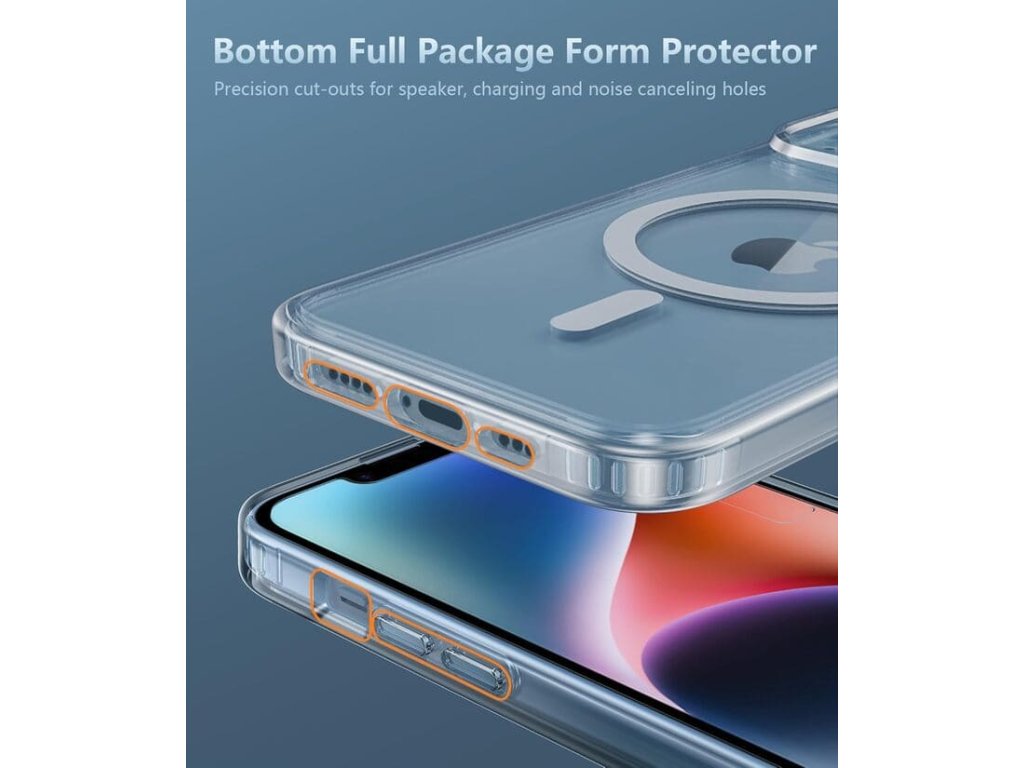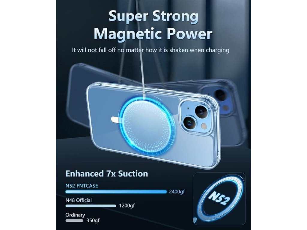 Kryt poskytuje komplexní ochranu a maximální funkčnost MagSafe. Silná Magnetická přitažlivost kryt má vestavěných 38 super N52 magnetů. Magnetická síla dosahuje 2400 gf což je téměř 7krát silnější než u běžných krytů. Zajišťuje pevné a stabilní připojení k MagSafe nabíječkám a příslušenství bez ovlivnění signálu. Vojenská ochrana proti pádu testovaná až do 10 FT. Základní deska je z pevného polykarbonátu a hrany jsou chráněny pružným TPU nárazníkem se 4 vestavěnými rohovými vzduchovými polštáři pro absorbci nárazu. Chrání telefon před náhodnými pády nárazy a poškrábáním. Vyrobeno z vysoce kvalitního ultra-čirého TPU a PC materiálu od společnosti Bayer. Kryt je křišťálově čistý a díky Nano antioxidační vrstvě nežloutne a odolává mastnotě a potu. Zvýšená Ochrana kamer a displeje zahrnuje přesné vyvýšené okraje pro kritické části telefonu: 2,5 mm okolo fotoaparátu 1,5 mm okraje nad displejem a 0,5 mm vyvýšené rohy na zadní straně. Tyto prvky minimalizují poškrábání a nárazy při položení nebo pádu. Navrženo speciálně a striktně formováno pro modely iPhone 13 a iPhone 14. Všechny otvory pro porty čočky a tlačítka jsou přesně kalibrovány.