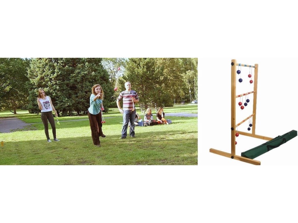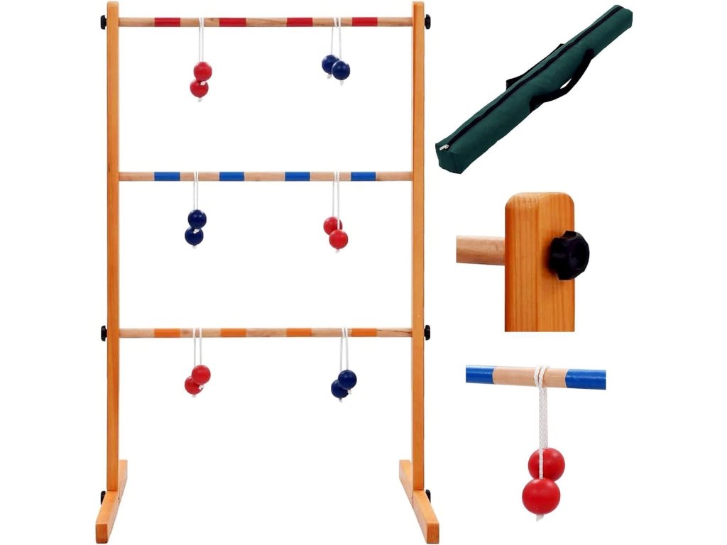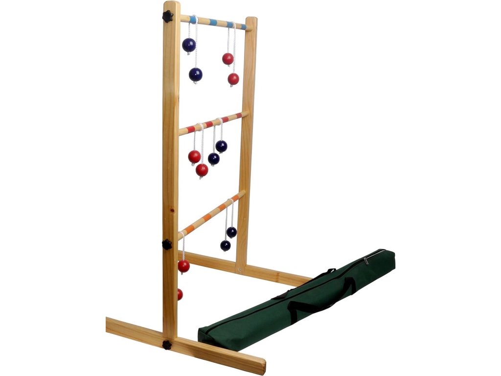 Venkovní hrací žebřík Izzy Leitergolf je zábavná házecí hra z robustního masivního borovicového dřeva vhodná pro celou rodinu od 3 let. Rozměry žebříku jsou 100 x 62 x 60 cm (výška x šířka x hloubka). Sada obsahuje žebřík, 12 kusů bolas ve čtyřech barvách a stabilní tašku na přenášení. Hra má veselý vzhled s lakovanými tyčemi v barvách zelené, modré a oranžové a její montáž je rychlá a bez nářadí.
