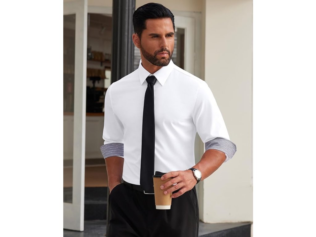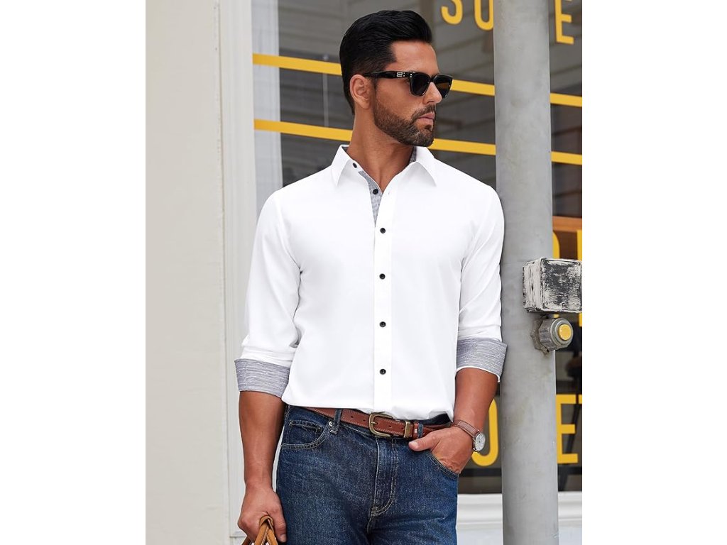 Moderní design doplňují kontrastní černé detaily na vnitřní straně rukávů, límci a knoflících, které dodávají košili současný charakter při zachování elegantního vzhledu.
