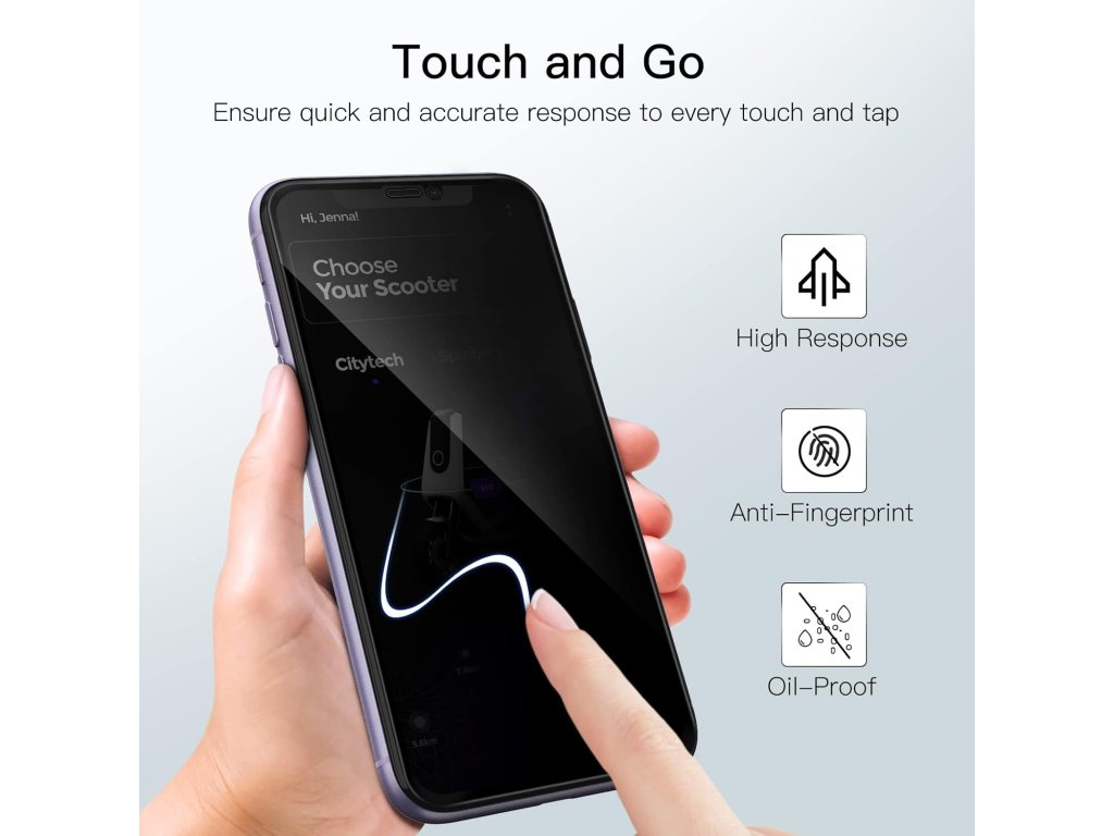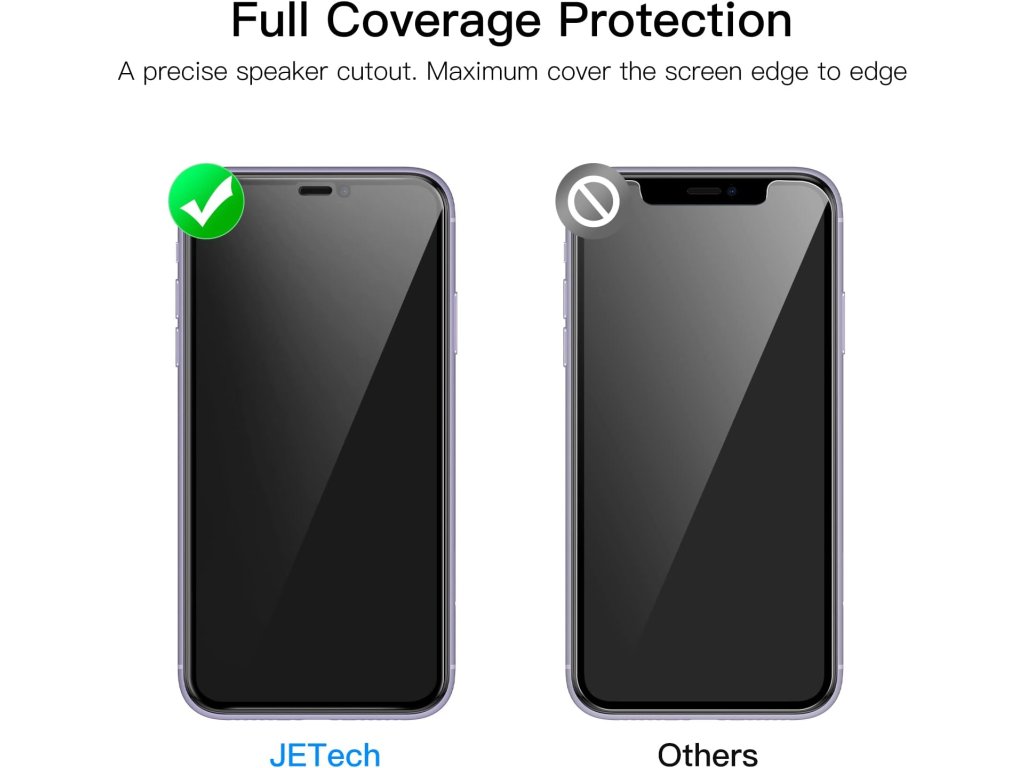 JETech Privacy ochranné sklo pro iPhone 11/XR (6.1 palce) je celoplošná anti-spy fólie z tvrzeného skla s tvrdostí 9H, která chrání vaše soukromí – obsah displeje je viditelný pouze přímo před obrazovkou. Poskytuje ochranu od okraje k okraji, je vysoce odolné proti poškrábání a neovlivňuje kompatibilitu s pouzdrem.