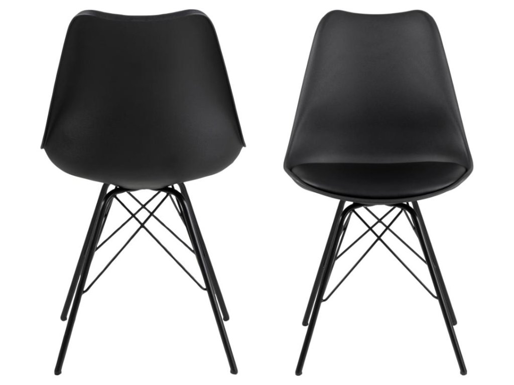 Elegantní černá jídelní židle Eris v moderním skandinávském designu. Sedák a opěradlo z odolného plastu s pohodlným polštářem z černé ekokůže. Stabilní černé kovové nohy s práškovým nástřikem podtrhují lehký a vzdušný vzhled. Tato židle je skvělou volbou do jídelny, kuchyně i dalších prostor. Její univerzální černá barva se snadno kombinuje s různými styly interiéru.