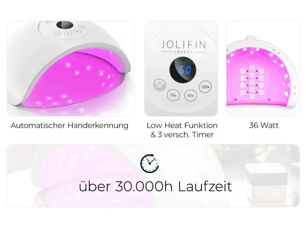 Jolifin LAVENI Dual UVA/LED vytvrzovací lampa Luna v bílé barvě je moderní a elegantní zařízení pro manikúru i pedikúru. Díky zvětšeným rozměrům, 30 vysoce účinným duálním LED diodám (365nm a 405nm) a odnímatelné magnetické základně zajišťuje optimální a šetrné vytvrzování gelů.