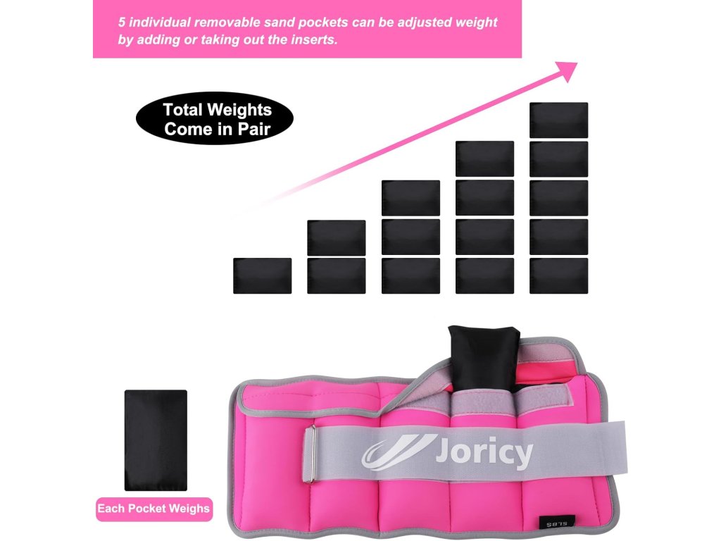 - Nastavitelná hmotnost: Každé závaží na kotník a zápěstí obsahuje 5 vyjímatelných pískových sáčků, přičemž každý váží 0,2 kg. Celkovou hmotnost páru (každý kotník 1,5 kg) lze nastavit přidáním nebo odebráním vložek v rozsahu od 1 do 3 kg (celkem pro pár).