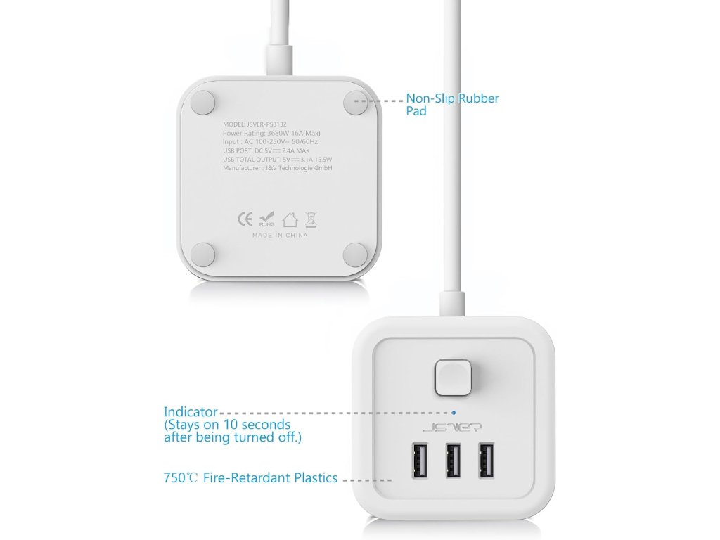 Tato praktická prodlužovací lišta JSVER nabízí 3 standardní zásuvky s maximálním výkonem 3680 W (16A, 230V) a tři USB nabíjecí porty (5V/3,1A celkem, 15,5W), každý s podporou rychlého nabíjení až 2,4A. Díky 1,5 metru dlouhému kabelu H05VV-F (3 x 1,5 mm²) snadno dosáhnete k napájení. Kompaktní design ve tvaru Rubikovy kostky (7,6 x 7,6 x 7,6 cm) je ideální pro úsporu místa na stole a snadné přenášení v batohu či tašce na cesty. Lišta je vybavena vypínačem pro snadné zapnutí a vypnutí všech připojených zařízení. Bezpečnost je zajištěna ochranou proti přetížení, nadproudu, přepětí, zkratu a špatnému kontaktu. Zásuvky jsou navíc opatřeny bezpečnostními kryty, které chrání děti a domácí zvířata před nechtěným kontaktem. Tato prodlužovací lišta s německou zástrčkou je skvělým řešením pro napájení více zařízení doma, v kanceláři nebo na cestách.