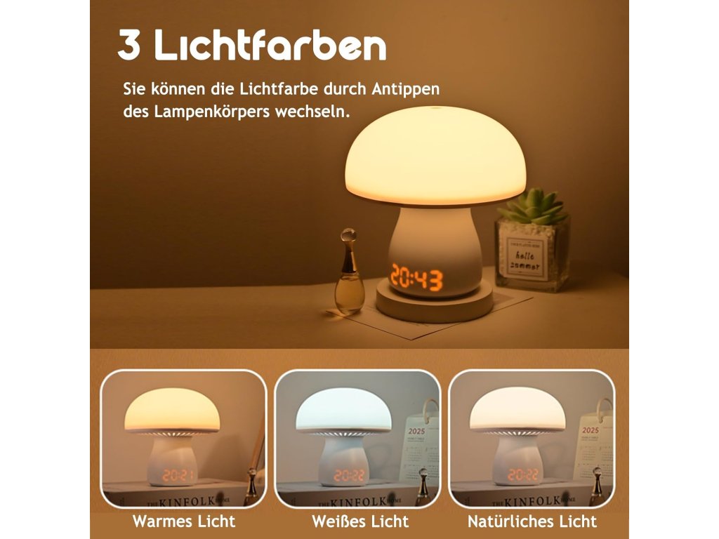 Ovládání je řešeno dotykovým spínačem, který umožňuje přepínat mezi třemi režimy světla: teplým, přirozeným a bílým. Dlouhým stisknutím lze plynule regulovat jas podle aktuální potřeby, od jemného nočního přisvícení až po jasnější světlo na čtení. Součástí lampičky je přehledný digitální displej s hodinami v režimu 12/24 hodin, který reaguje na zvuk – při zaznamenání hluku se rozsvítí a po 30 sekundách opět zhasne, čímž šetří energii. Praktická funkce časovače dovoluje nastavit automatické vypnutí světla po 15, 30 nebo 60 minutách, což ocení zejména rodiče při uspávání dětí.