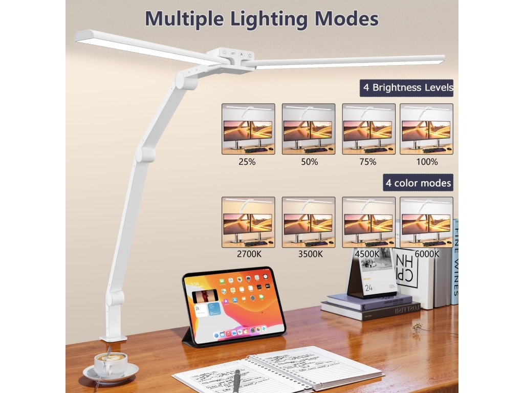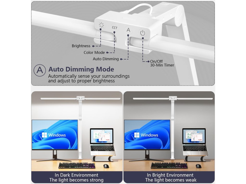 Lampa nabízí dotykové ovládání s 4 teplotami barev (2700K - 6000K) a 4 úrovněmi jasu (25% - 100%). Integrovaný inteligentní světelný senzor automaticky upravuje jas podle okolního osvětlení. Praktická kovová svorka šetří místo na stole a je kompatibilní s deskami o tloušťce až 5,5 cm. Funkce časovače automatického vypnutí po 30 minutách se aktivuje dlouhým stiskem tlačítka napájení.