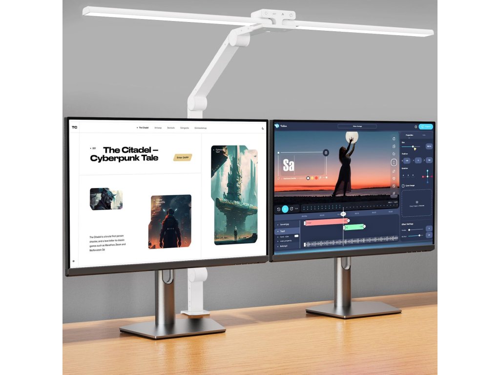 Tato vysoce výkonná 24W LED stolní lampa KableRika je vybavena dvěma světelnými panely s celkovou šířkou až 80 cm, poskytující ultra jasné osvětlení (1200 lm) pro velké pracovní plochy, zakřivené či duální monitory a stoly ve tvaru L. Sklopením panelů lze lampu použít i jako boční osvětlení pro cílenou práci. Flexibilní sklopné rameno (225°) a otočná základna (360°) s pevnými klouby umožňují nastavení světla do libovolného směru až do maximální výšky 68 cm, ideální pro práci, hobby, šití, čtení a studium.