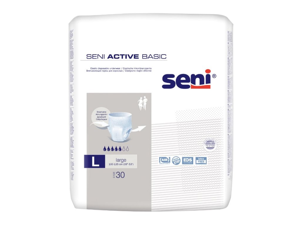 Absorpční kalhotky Seni Active Basic Large jsou prodyšné jednorázové natahovací kalhotky pro střední stupeň inkontinence, určené pro obvod boků 100-135 cm a savost 1050 ml. Připomínají klasické spodní prádlo, jsou v bílé barvě, nešustí a snadno se stahují i svlékají. Balení obsahuje 30 kusů.