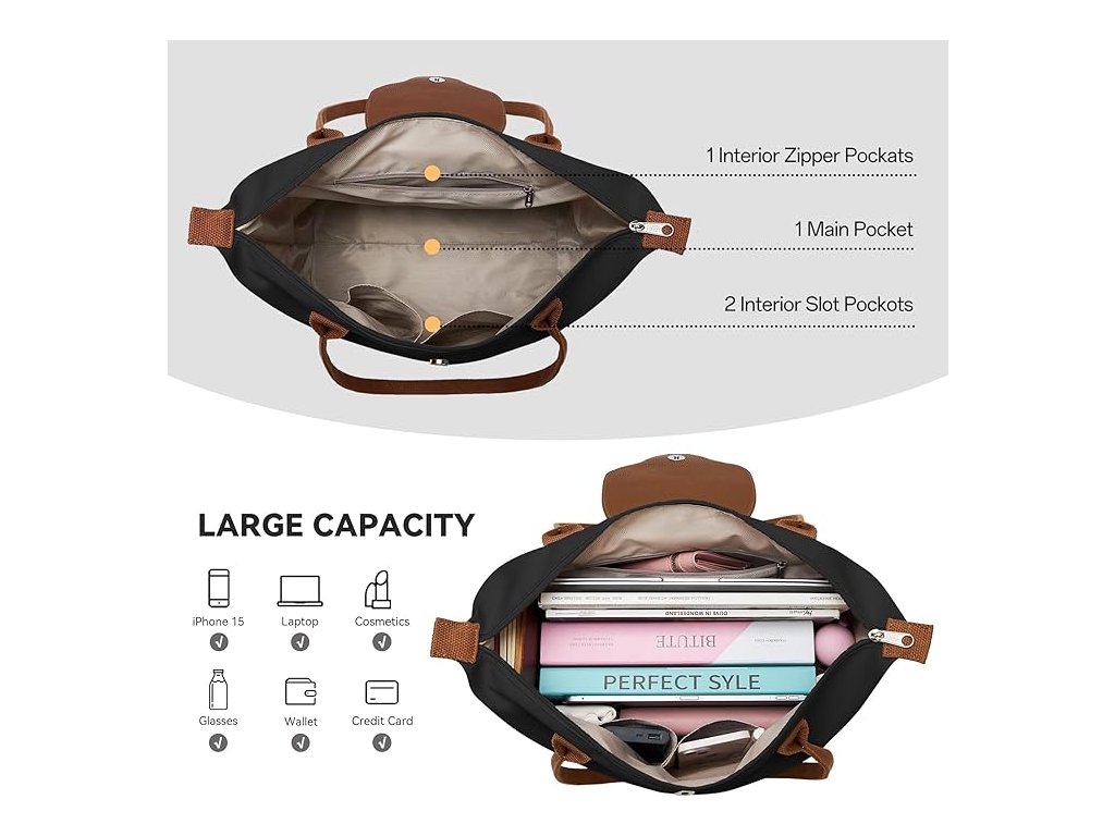 Kabelka je vyrobena z vysoce kvalitního nylonu, který vyniká svou odolností a schopností odpuzovat vodu. Konstrukce tašky je lehká, ale zároveň dostatečně pevná pro každodenní zátěž. Hlavní úložný prostor disponuje velkou kapacitou a bez problémů pojme notebook do velikosti 13,3 palce, tablet, časopisy a další osobní věci. Vnitřní uspořádání zahrnuje jednu hlavní komoru, jednu bezpečnostní kapsu na zip pro cennosti a dvě další kapsy pro přehlednou organizaci drobností.