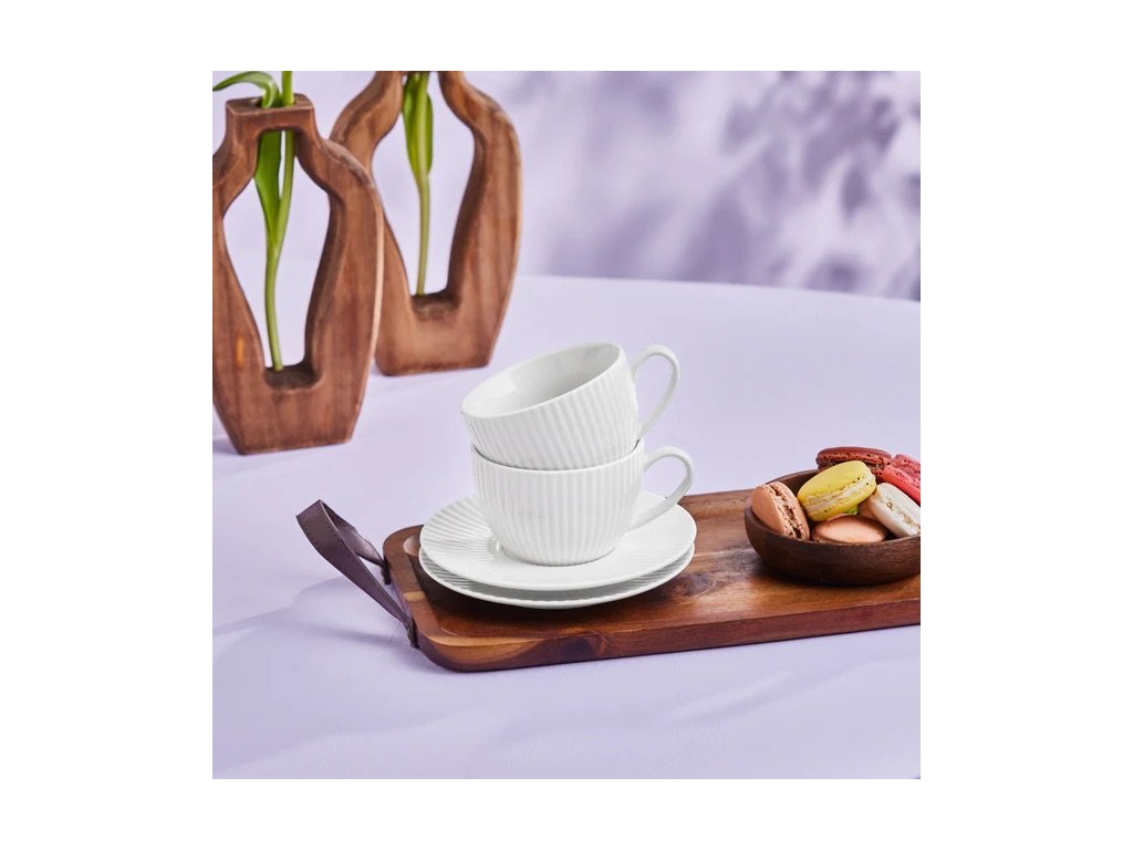 Šálky mají rozměry 9 cm x 5,9 cm a podšálky 14,6 cm x 1,6 cm. Jsou vyrobeny z kvalitního bílého porcelánu, který vyniká svou jemností a elegancí. Design s jemnými liniemi inspirovaný mořskými mušlemi dodá vašemu čajovému servisu sofistikovaný vzhled.