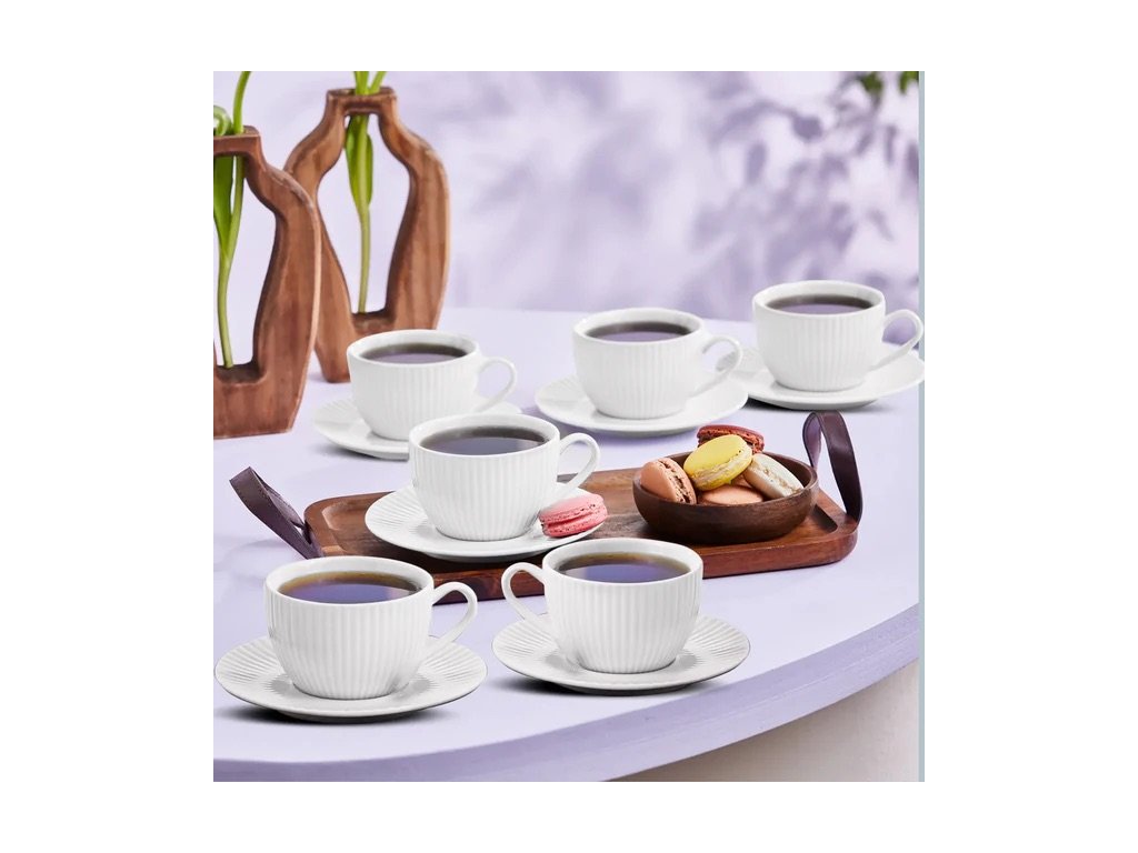 Sada 12 porcelánových šálků a podšálků Karaca Seashell pro 6 osob. Objem šálku 200 ml, bílá barva, doporučeno ruční mytí.