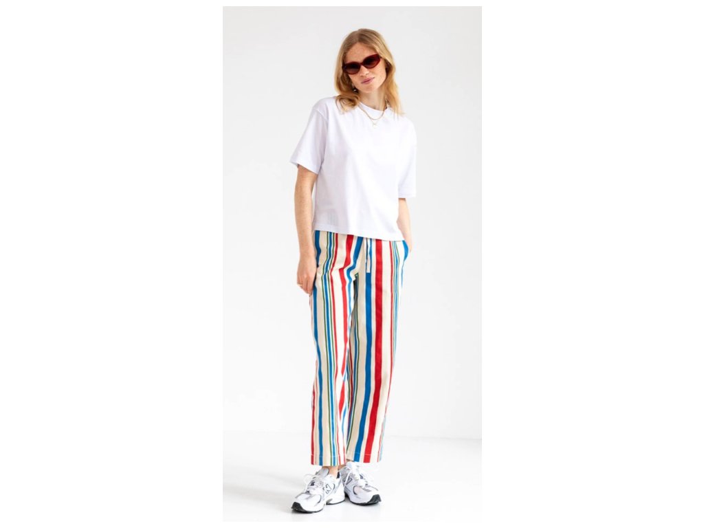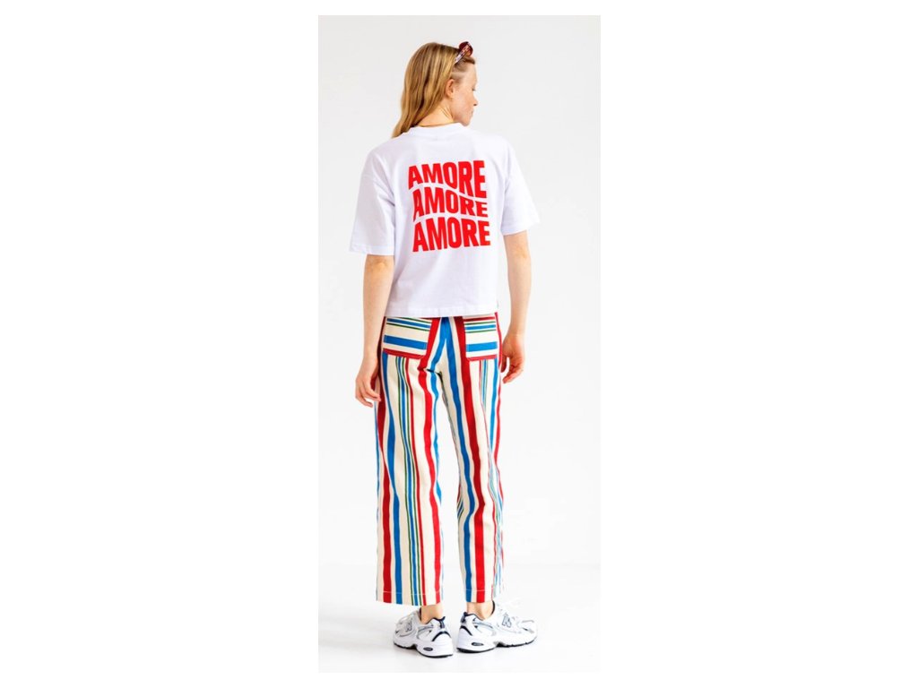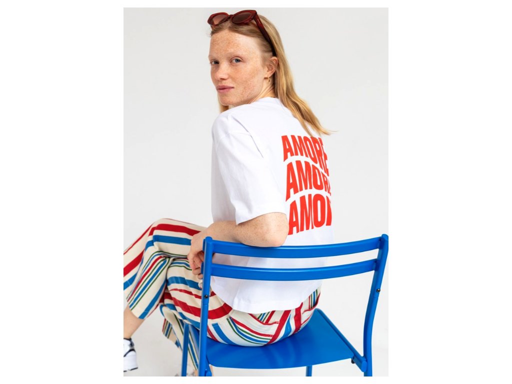 Bílé základní triko kombinuje minimalistický design přední strany s dominantním červeným nápisem „Amore“ na zadní části. Je ušito z příjemně měkké bio bavlny, která zaručuje vysokou prodyšnost a šetrnost k pokožce. Střih je navržen jako volnější a krabicový (kastiger fit), což zajišťuje ležérní vzhled a volnost pohybu. Široký kulatý výstřih doplňuje celkovou uvolněnou siluetu modelu. Díky čistému přírodnímu materiálu bez příměsí je triko ideální volbou pro každodenní nošení během celého roku.