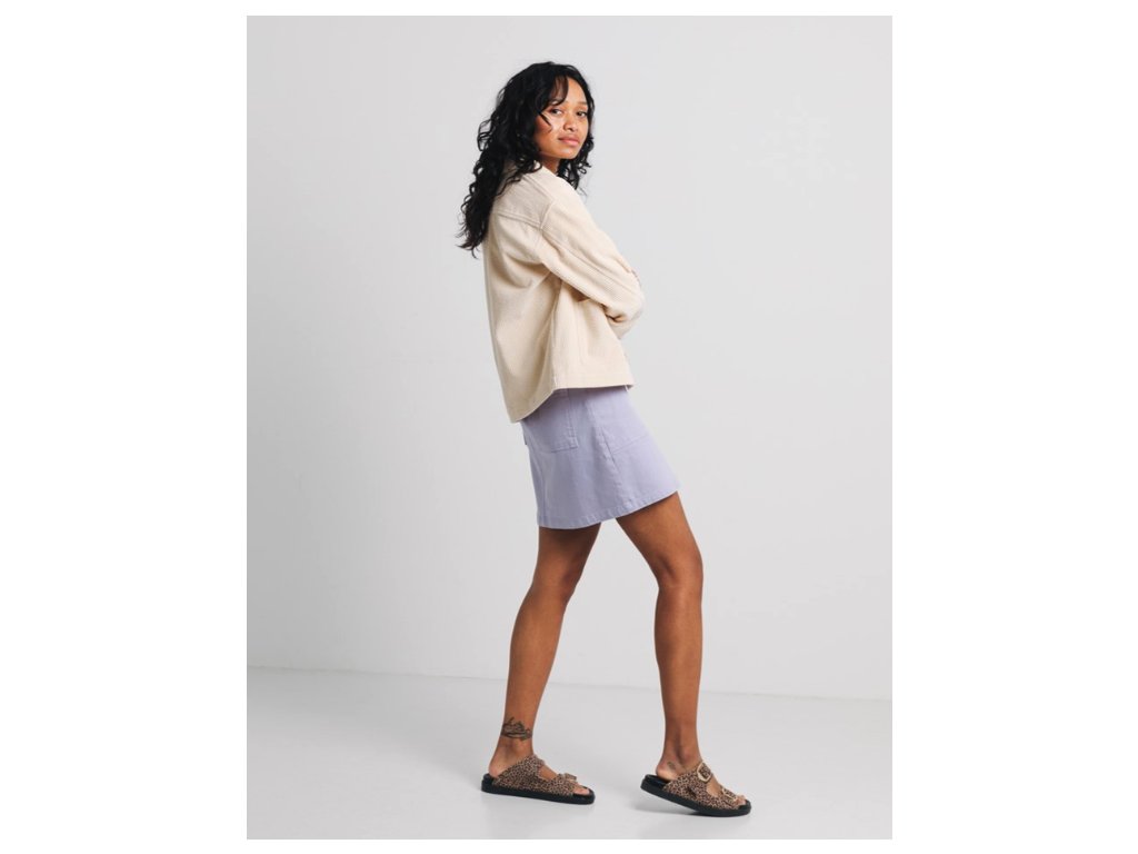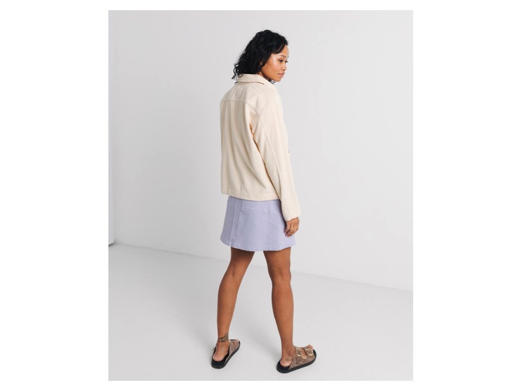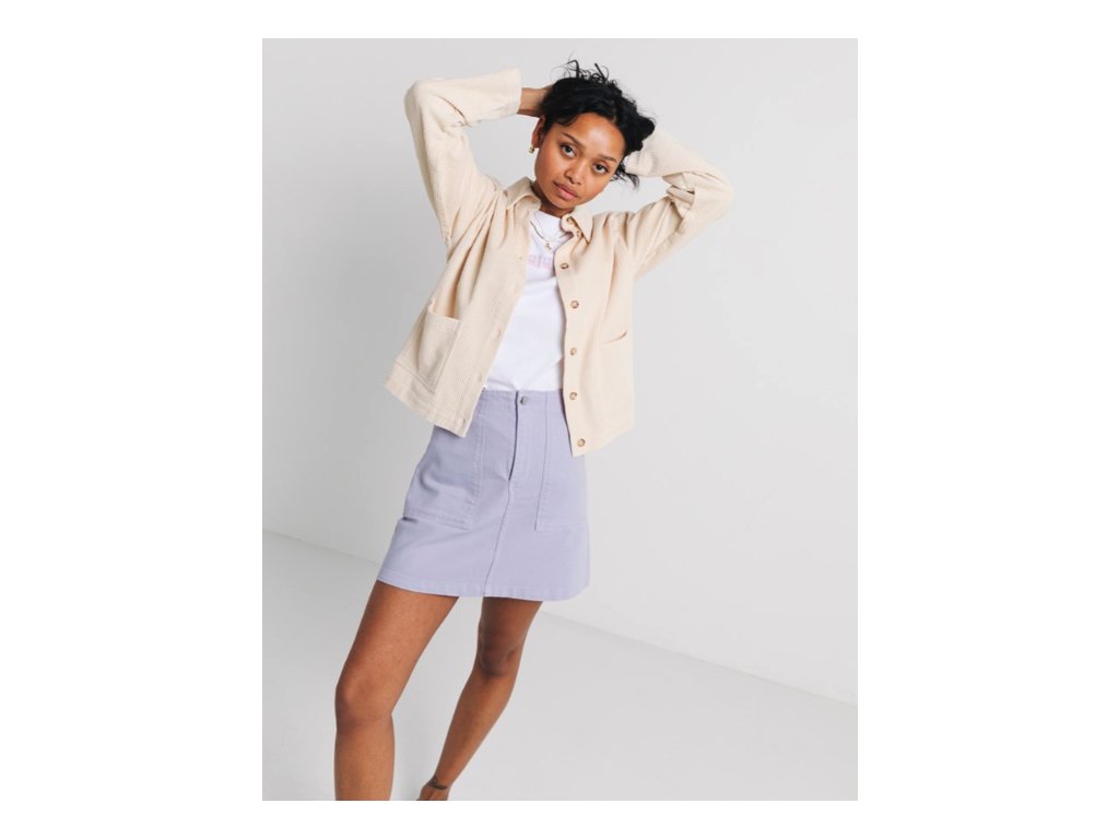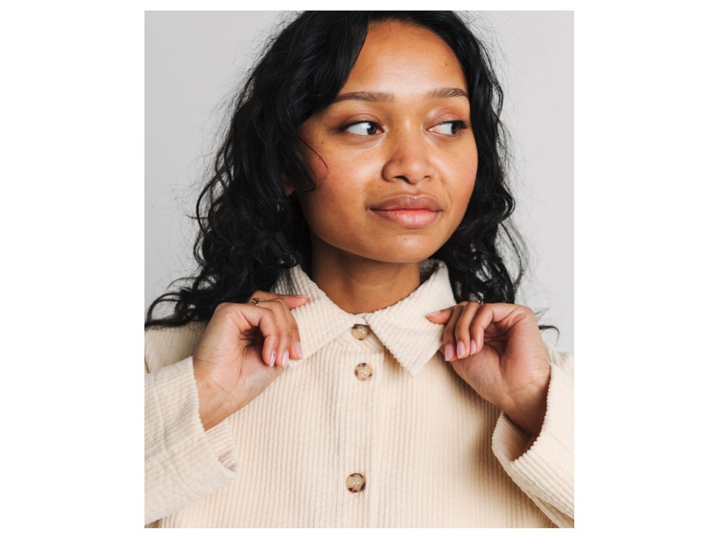 Tenká bunda z jemného manšestru představuje ideální svrchní vrstvu pro přechodné období. Je ušita z měkké bio bavlny, která zajišťuje vysoký komfort při nošení a šetrnost k životnímu prostředí. Design bundy doplňují stylové knoflíky v rohovinovém vzhledu a klasický košilový límec. Střih je navržen jako volnější se sníženou linií ramen, což oděvu dodává ležérní nádech. Praktickým prvkem jsou dvě velké nakládané boční kapsy pro uložení nezbytností. Díky čisté krémové barvě a minimalistickému provedení je bunda velmi snadno kombinovatelná s různými styly oblečení.