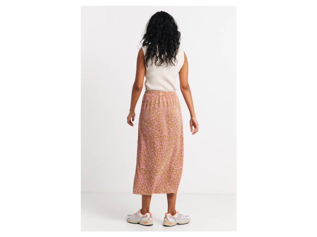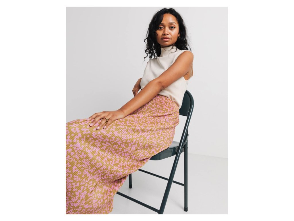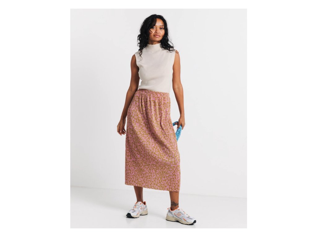 Sukně v midi délce kombinuje nadčasový design s udržitelným materiálem. Celoplošný vzor drobných květů v hořčicově žluté a růžové barvě doplňuje jemné plisování, které dodává oděvu lehkost a pohyb. Model je navržen s vysokým sedem (highwaist), což lichotí postavě, a je vybaven pružným gumovým pasem pro snadné oblékání a celodenní komfort. Hlavním materiálem je recyklovaný polyester, který je lehký, splývavý a snadný na údržbu. Tento kousek byl navržen v Berlíně a vyroben v Portugalsku, což podtrhuje kvalitu zpracování.