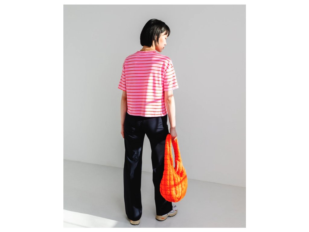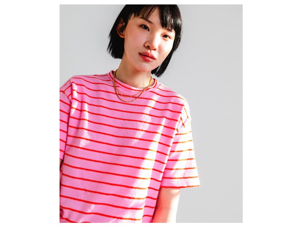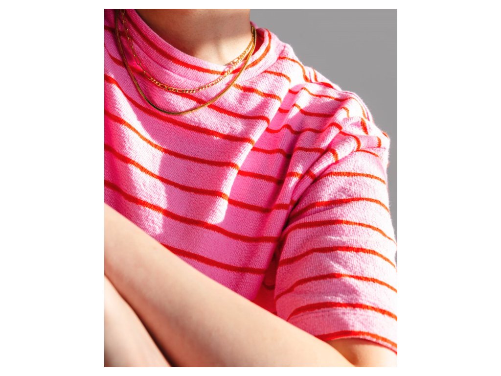 Barevné pruhované triko představuje ideální doplněk pro letní šatník díky kombinaci hravého designu a funkčního materiálu. Je ušito z čisté bavlny s charakteristickou froté úpravou na povrchu, která je velmi příjemná při kontaktu s pokožkou a dobře absorbuje vlhkost. Barevná kombinace sytě růžové a červené barvy dodává modelu moderní a energický vzhled. Střih je navržen pro pohodlné každodenní nošení a snadno se kombinuje s džínovými šortkami nebo sukněmi. Díky přírodnímu složení materiálu je triko prodyšné a udržuje si svou měkkost i po opakovaném praní.