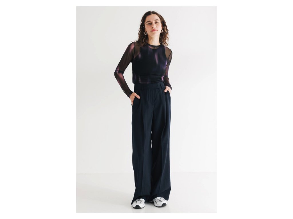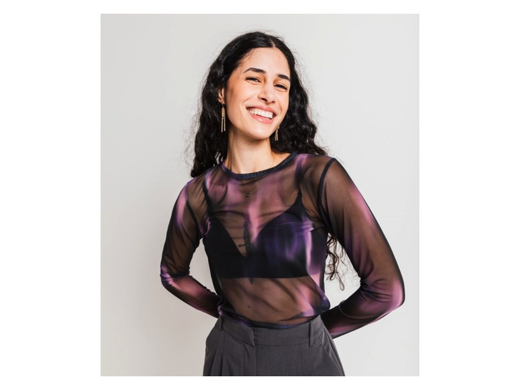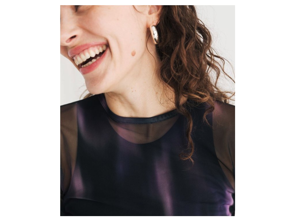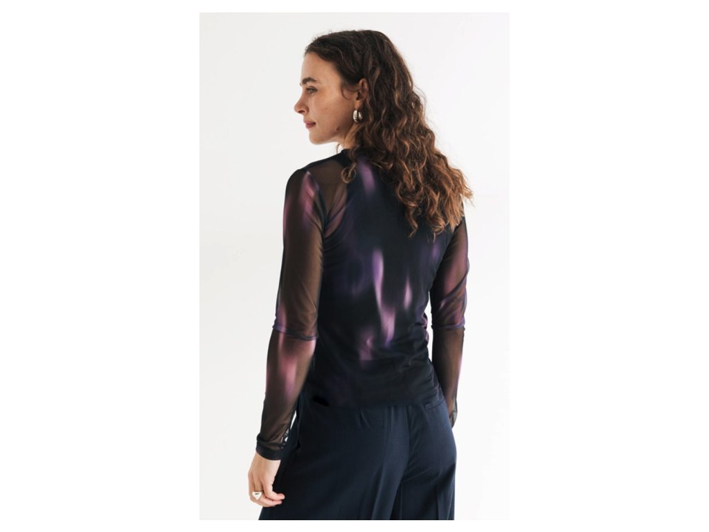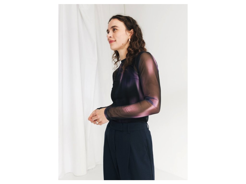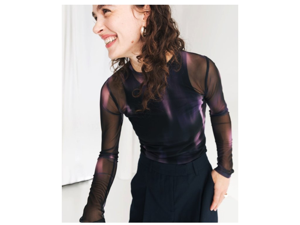 Triko s dlouhým rukávem a kulatým výstřihem kombinuje odvážný design s udržitelným přístupem. Hlavním vizuálním prvkem je plynulý barevný přechod (farbverlauf) mezi černou a fialovou barvou. Oděv je ušit z velmi lehké, průhledné a pružné tkaniny, která se skládá z 95 % z recyklovaného polyesteru a 5 % z elastanu. Střih je navržen jako těsně přiléhavý (körperbetonter fit), což z něj činí ideální kousek pro vrstvení. Produkt byl navržen v Berlíně a vyroben v Bulharsku. Vzhledem k úplné transparentnosti materiálu je vhodné pod triko zvolit samostatný top nebo spodní vrstvu (není součástí balení).