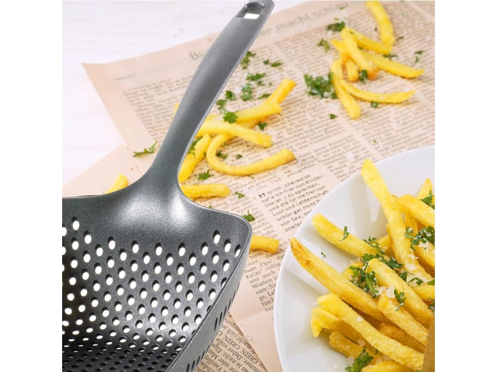 Tato elegantní naběračka od značky Kerafactum je navržena pro přesné a hygienické porcování v domácnostech i v cateringu. Univerzální použití a odolnost Naběračka je ideální pro dávkování ledu (kostky drcený led) pro koktejly a long drinky. Je vhodná pro horké i studené potraviny jelikož odolává teplotám až do 220 °C (lze ji použít i pro hranolky). Robustní a stabilní konstrukce s praktickou dlouhou rukojetí zajišťuje přesné porcování a snadnou manipulaci. Perforace pro efektivitu Lopatka je opatřena přesnou laserovou perforací (otvory) která umožňuje odvod přebytečné vody z ledu nebo oleje z horkých hranolek. Hygiena a snadná údržba Díky kvalitnímu materiálu je naběračka hygienická a lze ji snadno čistit. Je vhodná do myčky nádobí což usnadňuje její použití v každodenním provozu.