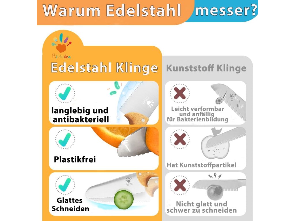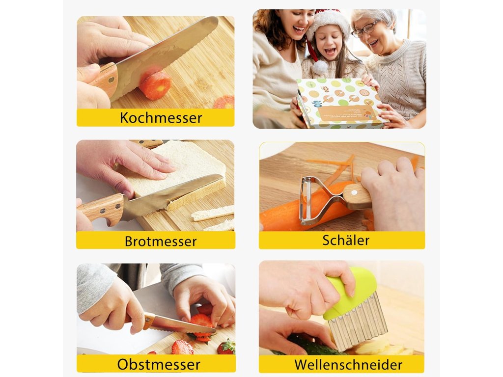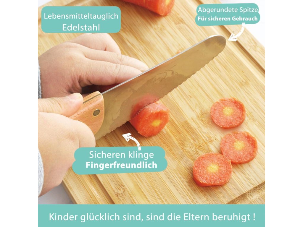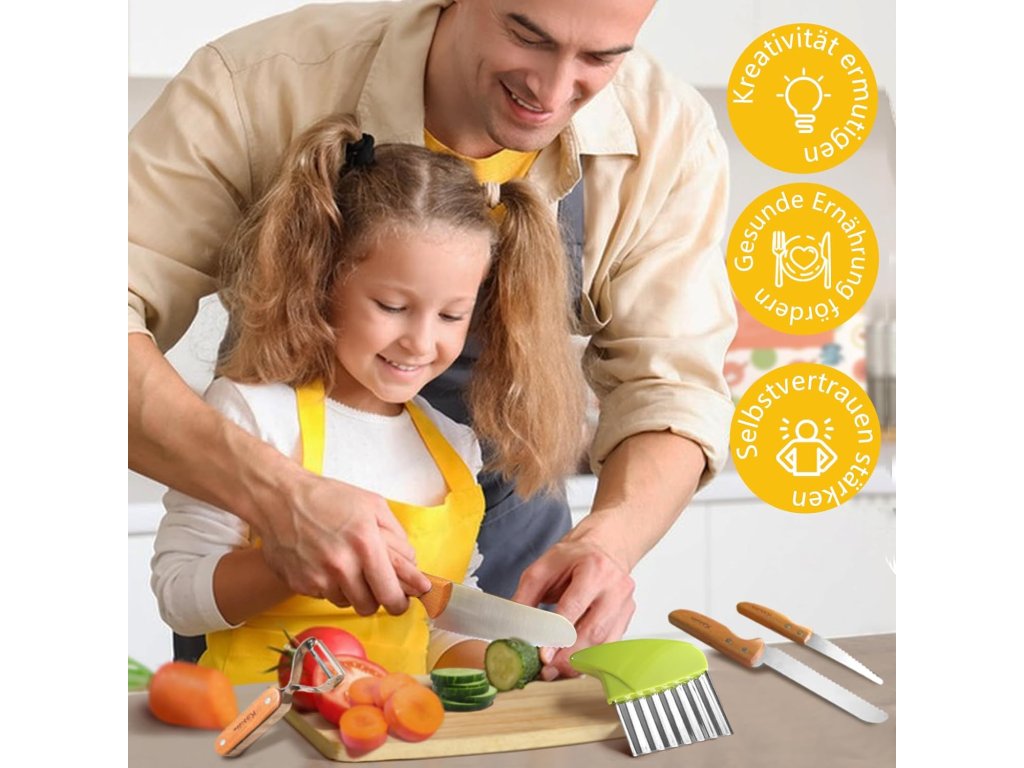 Kuchyňské nože v této sadě jsou vyrobeny z nerezové oceli s hladkým povrchem a jsou vybaveny bezpečnostním zoubkovaným ostřím, které umožňuje krájet potraviny principem řezání, aniž by hrozilo riziko vážného poranění. Rukojeti z bukového dřeva disponují protiskluzovou úpravou a speciálními drážkami pro prsty pro pevný a stabilní úchop. Součástí sady je také lehké dřevěné prkénko a praktická škrabka s rukojetí z jilmového dřeva. Náčiní pomáhá trénovat koordinaci rukou a očí při rodinném vaření, oslavách nebo společných večeřích.