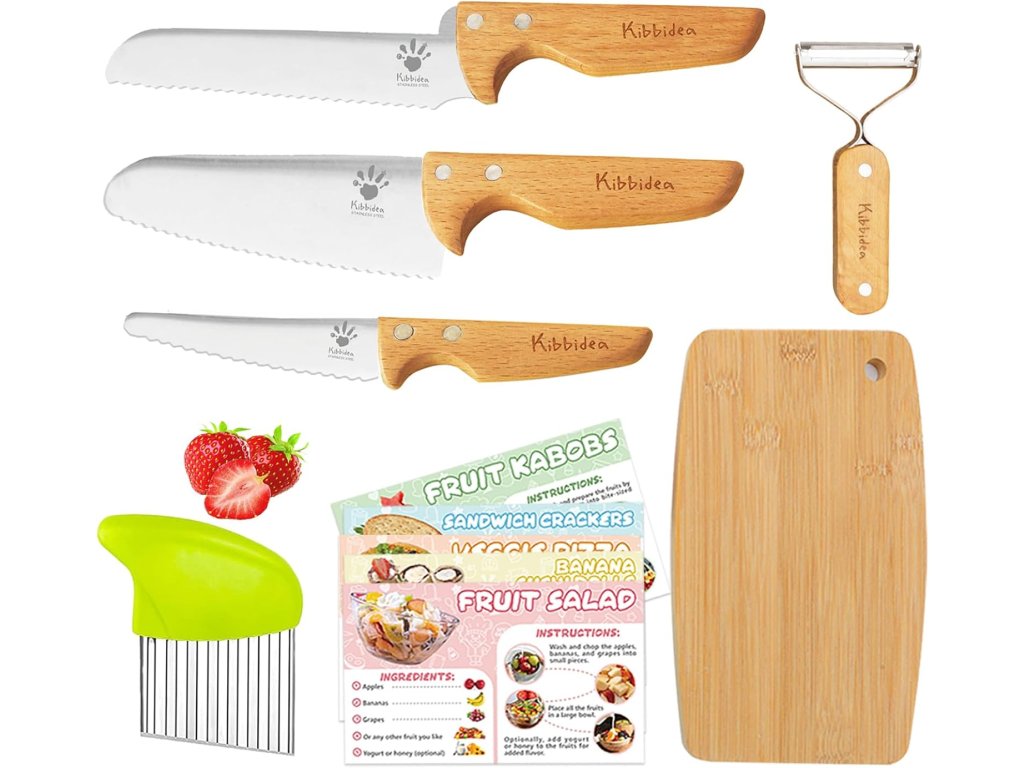 Kibbidea Sada dětských kuchyňských nožů se škrabkou a prkénkem 7 kusů