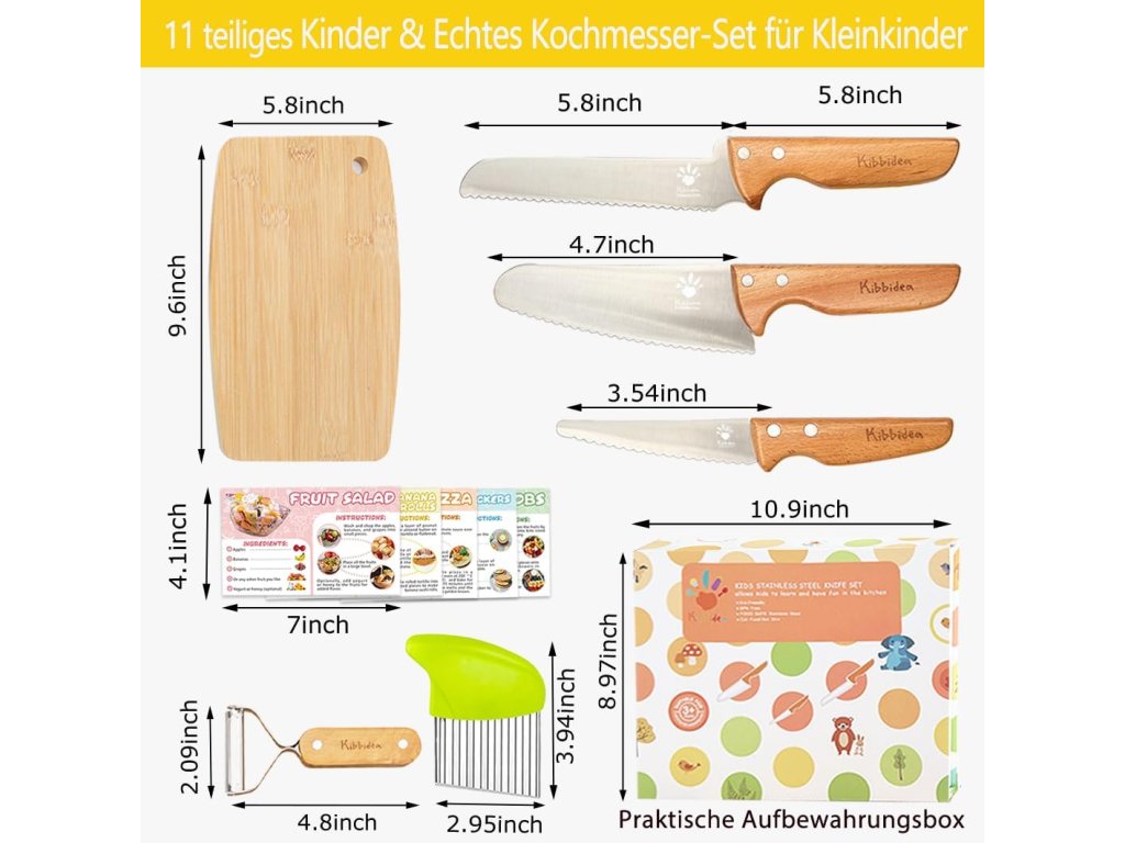 Obsah balení: 1 stabilní dřevěné prkénko 1 nůž na brambory 1 škrabka na zeleninu 1 nůž na pečivo 1 nůž na ovoce 1 nůž na zeleninu 5 receptů pro děti
