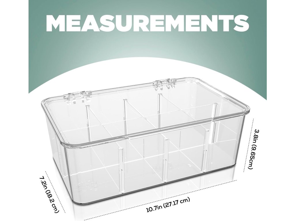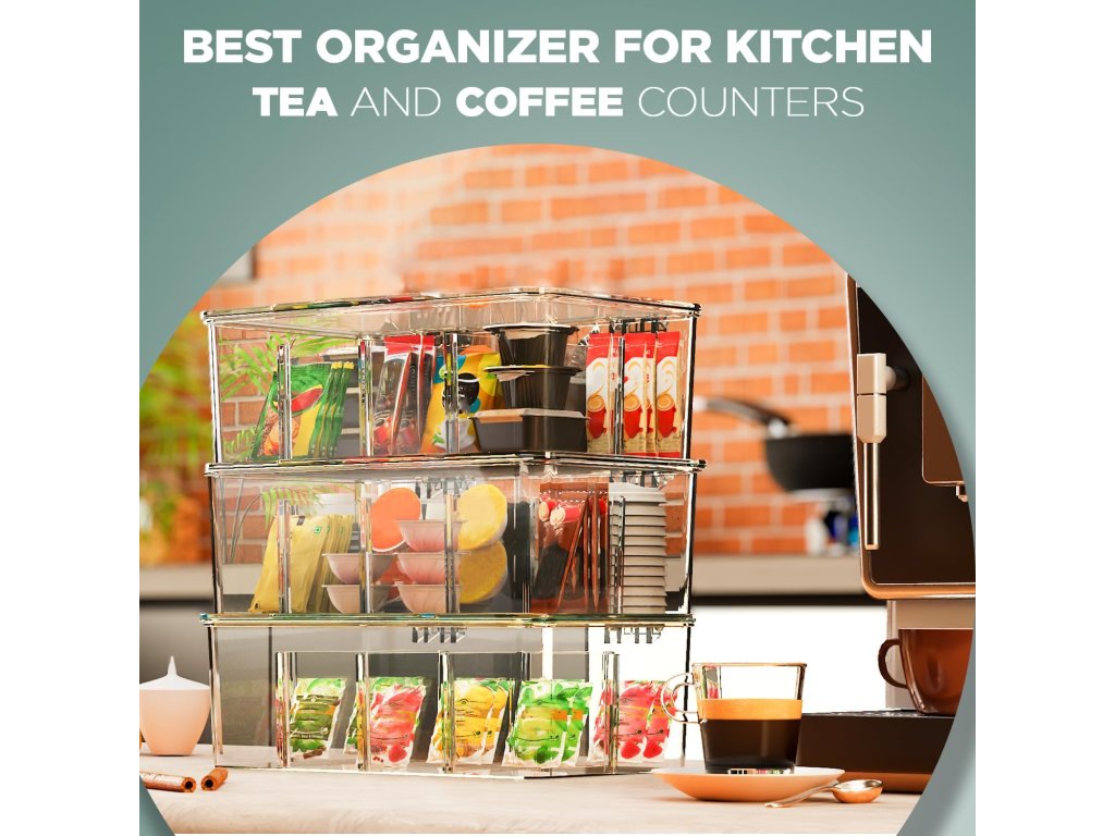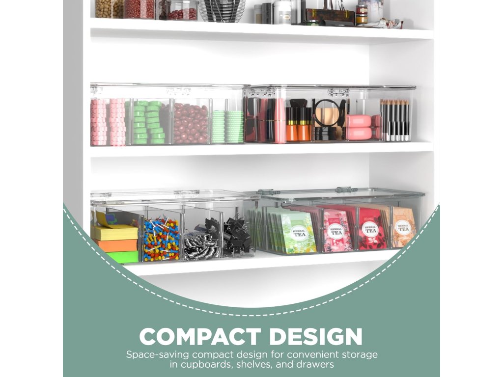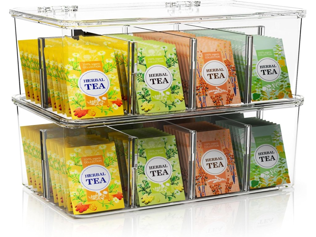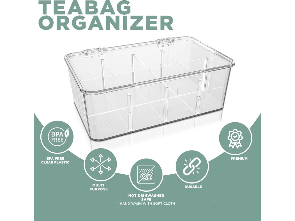 Udělej si pořádek s moderními průhlednými úložnými boxy KICHLY! Tato sada obsahuje 2 praktické boxy s 8 přihrádkami, každý o rozměrech 27,2 x 18,4 x 9,7 cm. Skvěle se hodí na uspořádání čajových sáčků, cukru, soli, sladidel, kávových kapslí a dalších drobností k pití.