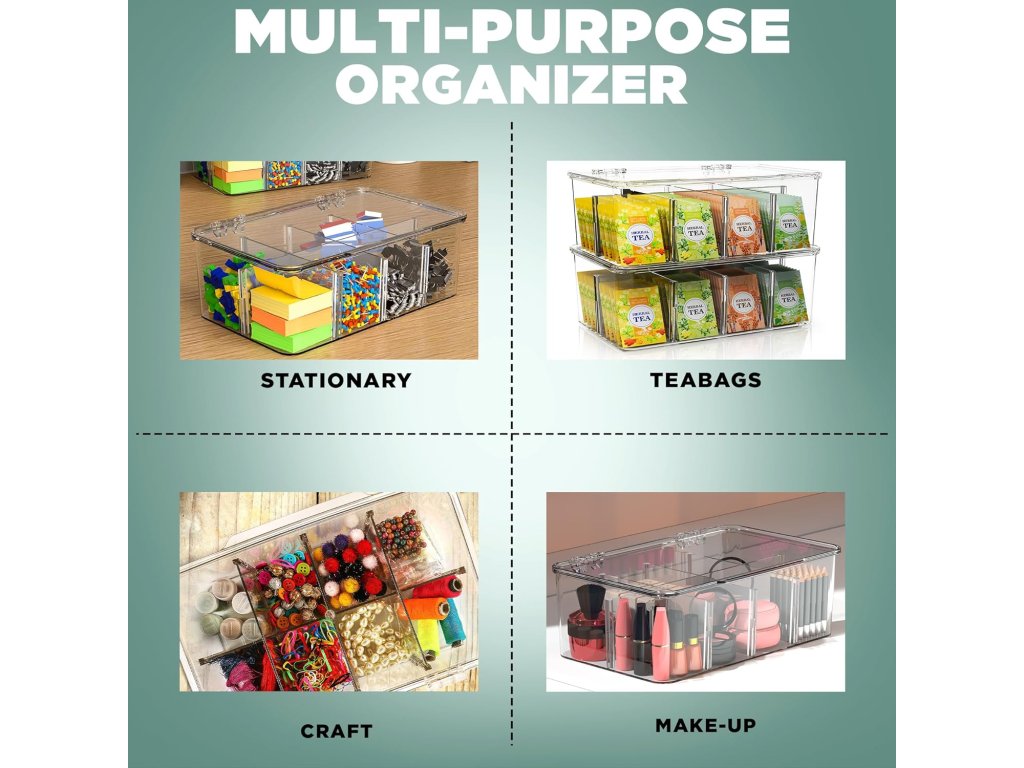 Sada 2 průhledných plastových úložných boxů KICHLY s 8 přihrádkami. Ideální na čajové sáčky, koření, kancelářské potřeby nebo kosmetiku.