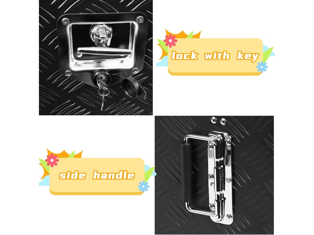 Robustní a odolný hliníkový box na nářadí KIMORE o rozměrech 46 x 46 x 42 cm, ideální pro pickupy, karavany, přívěsy, nákladní vozy nebo do dílny. Vyroben z vysoce kvalitního kovu s diamantovým vzorem, který zvyšuje estetiku i pevnost. Ručně svařované švy zajišťují vynikající utěsnění, chrání nářadí před nepříznivým počasím a korozí.