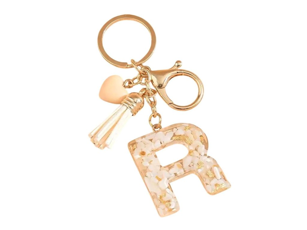 Klíčenka s průhledným písmenem R a bílými a zlatými kamínky. Má ozdobný střapec a srdíčko.